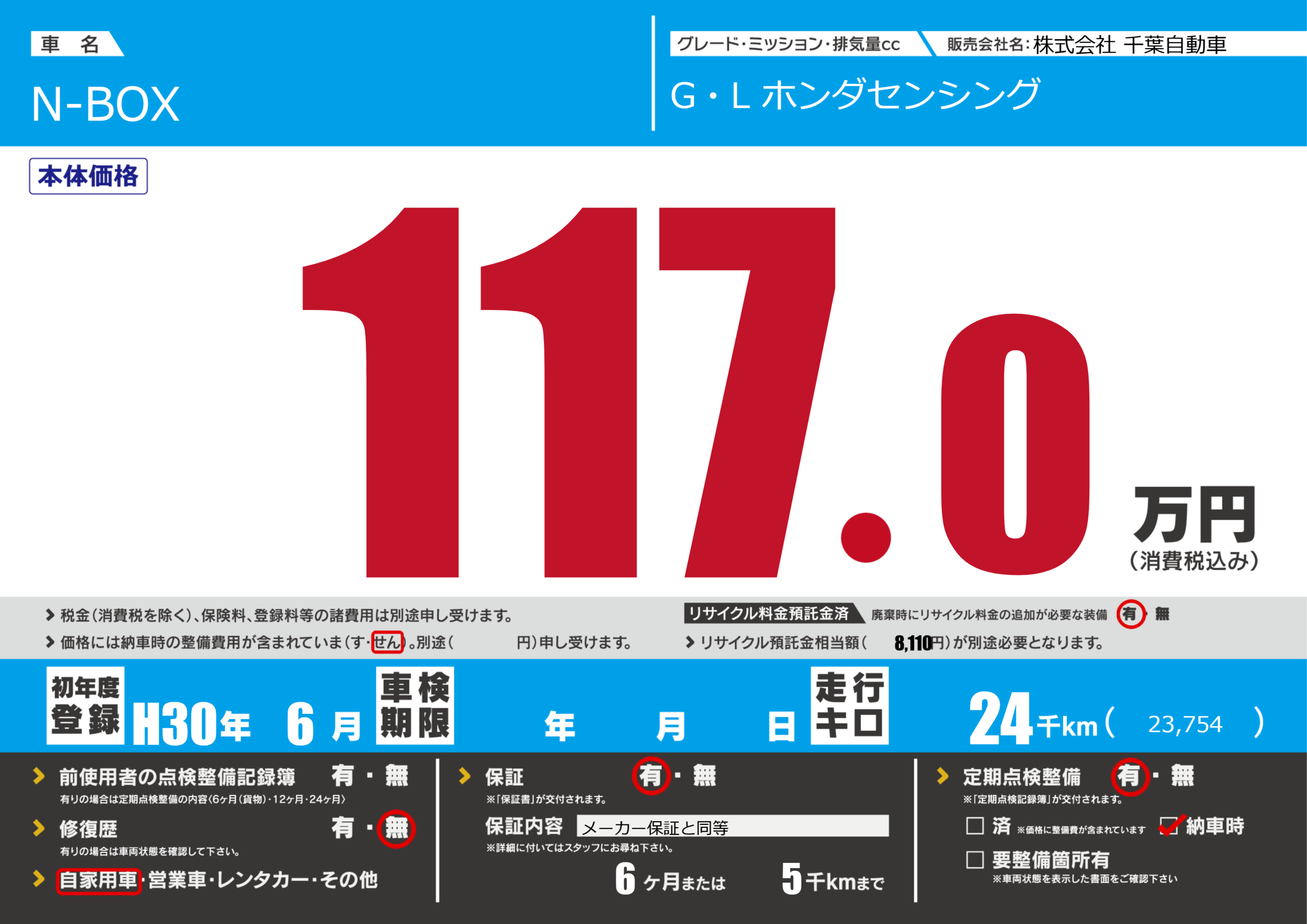 | 車名 | N-BOX | グレード ミッション 排気量 |