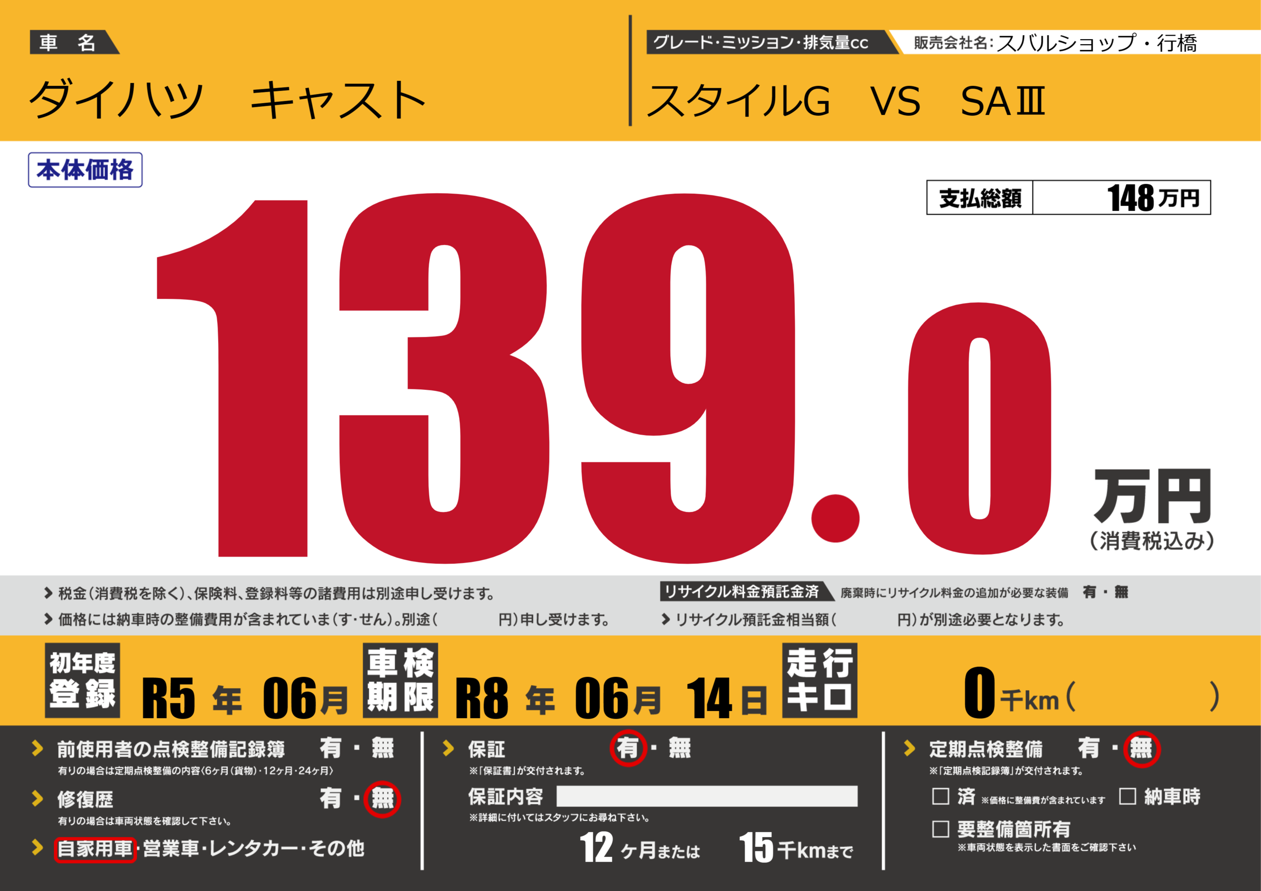 保証付き 保証内容(---) 12ヶ月または(15)千kmまで |