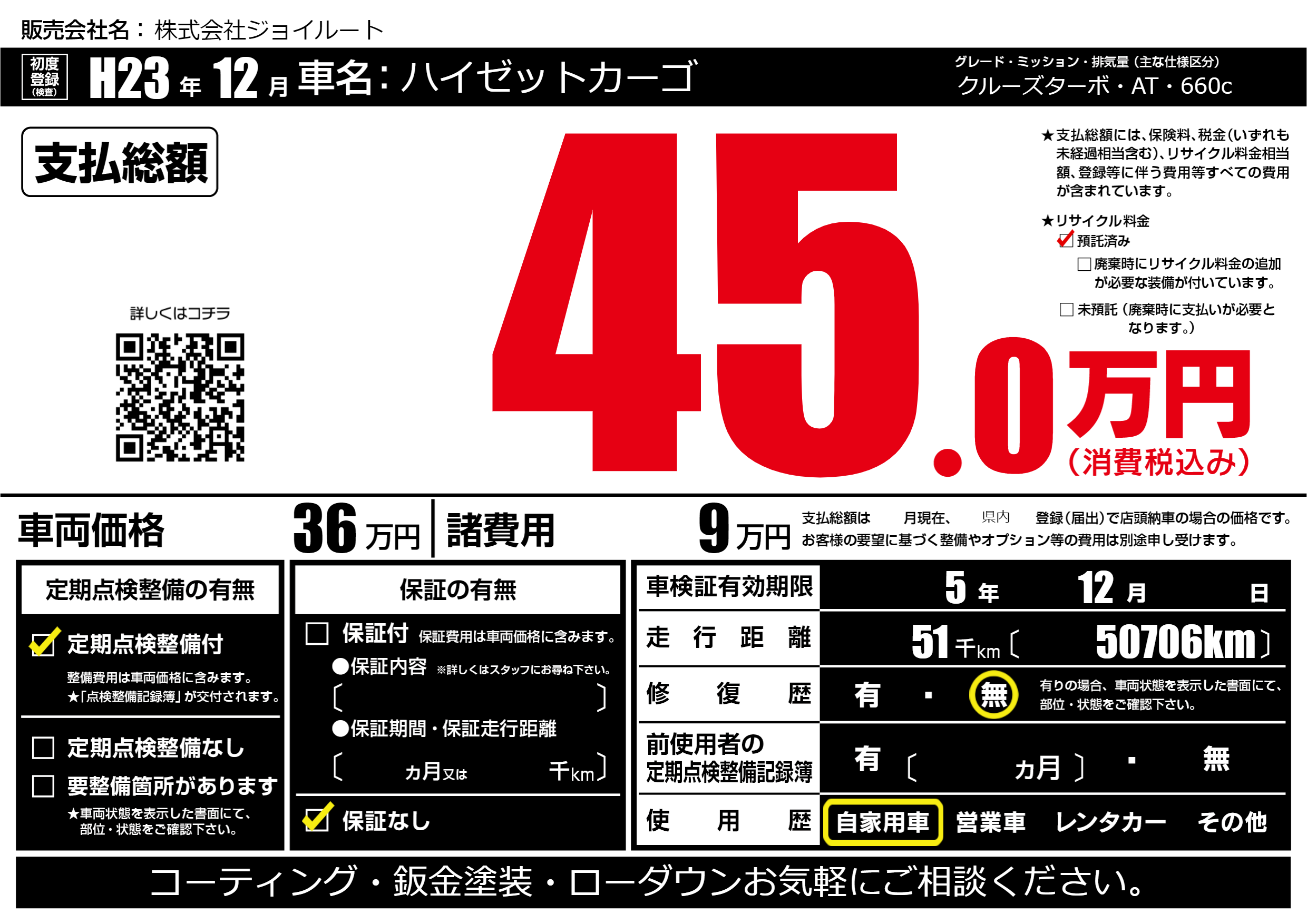 | 走行キロ | 5.1万km | 初年度登録 | H23年12月 |