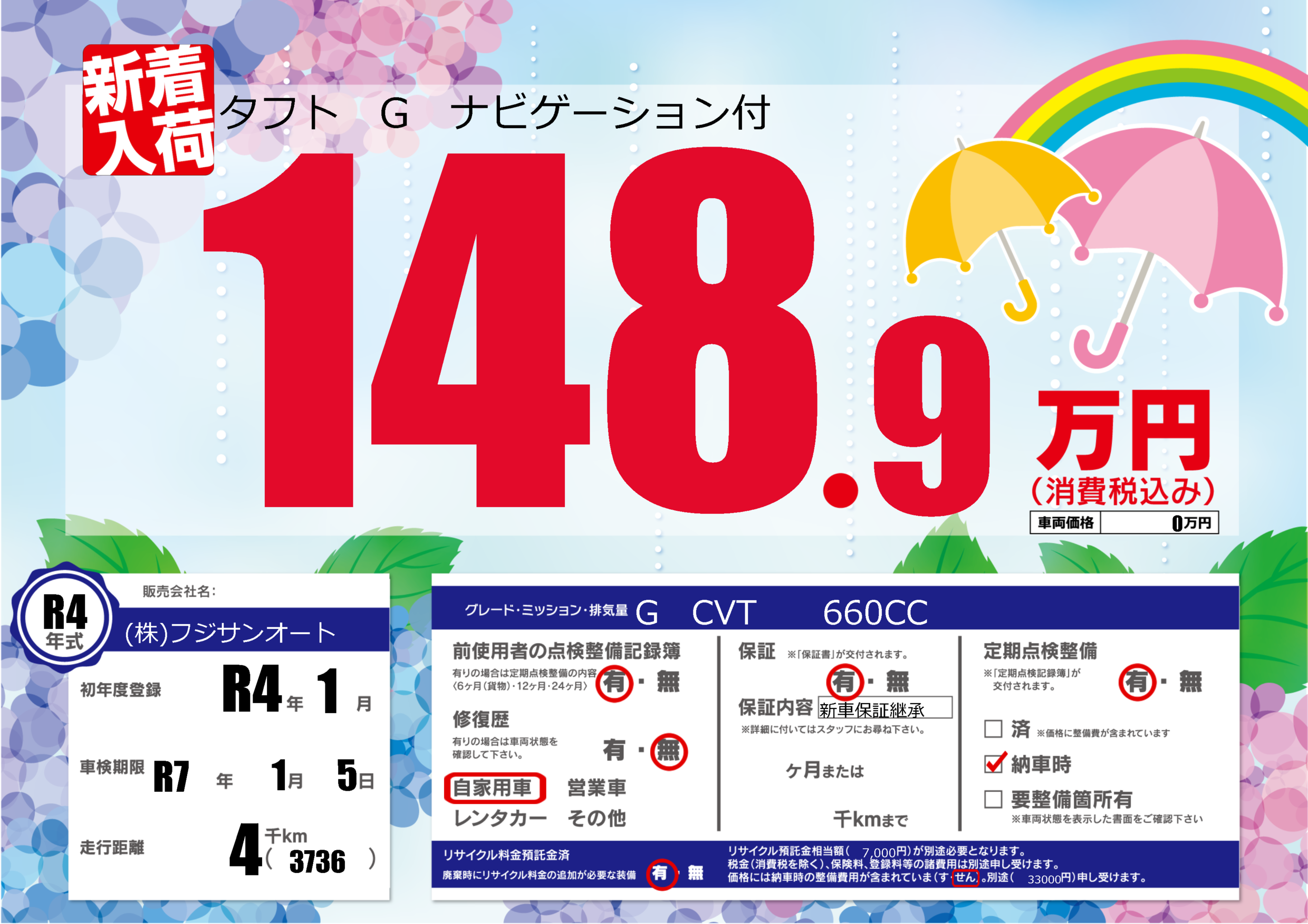 | 車名 | タフト G ナビゲーション付 | グレード ミッション 排気量 |