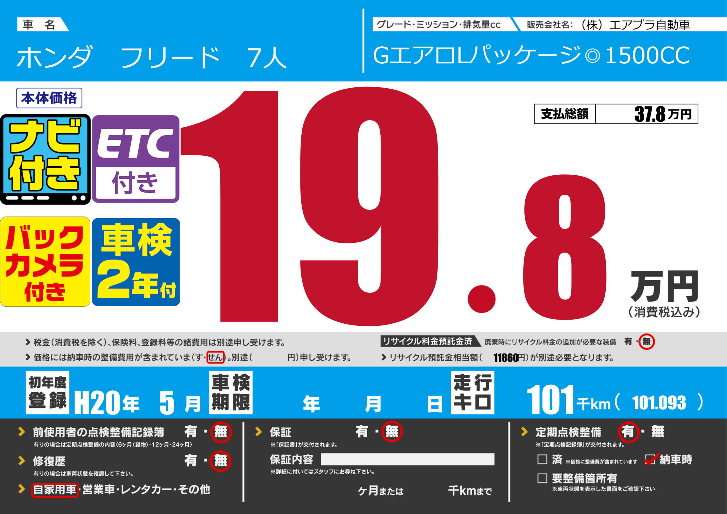 | 車名 | ホンダ フリード 7人 | グレード ミッション 排気量 |