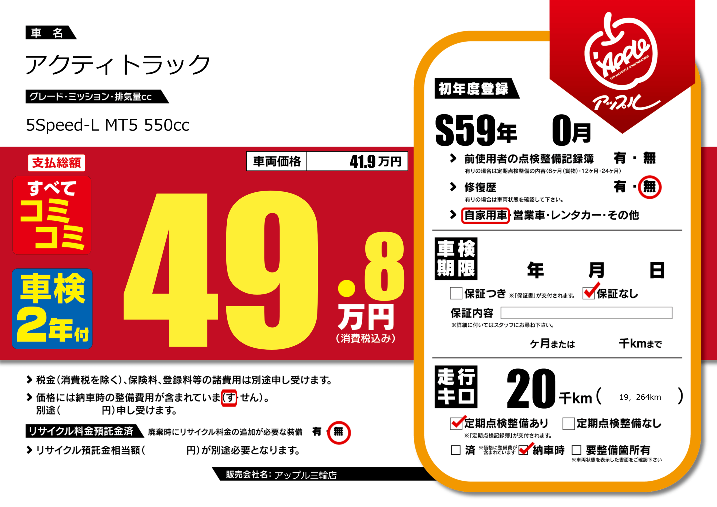 | 定期点検整備 | 定期点検整備あり 納車時あり | ||
