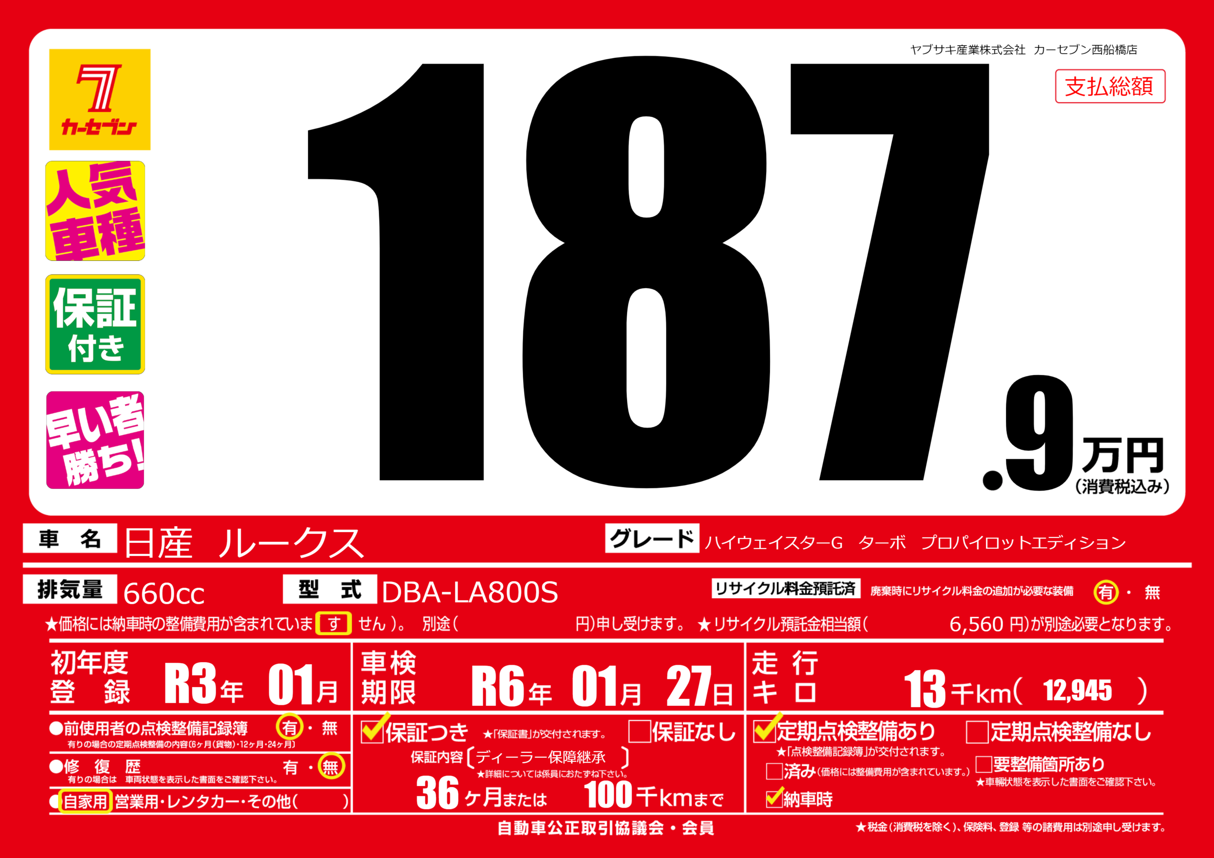 | 走行キロ | 1.3万km | 初年度登録 | R3年01月 |
