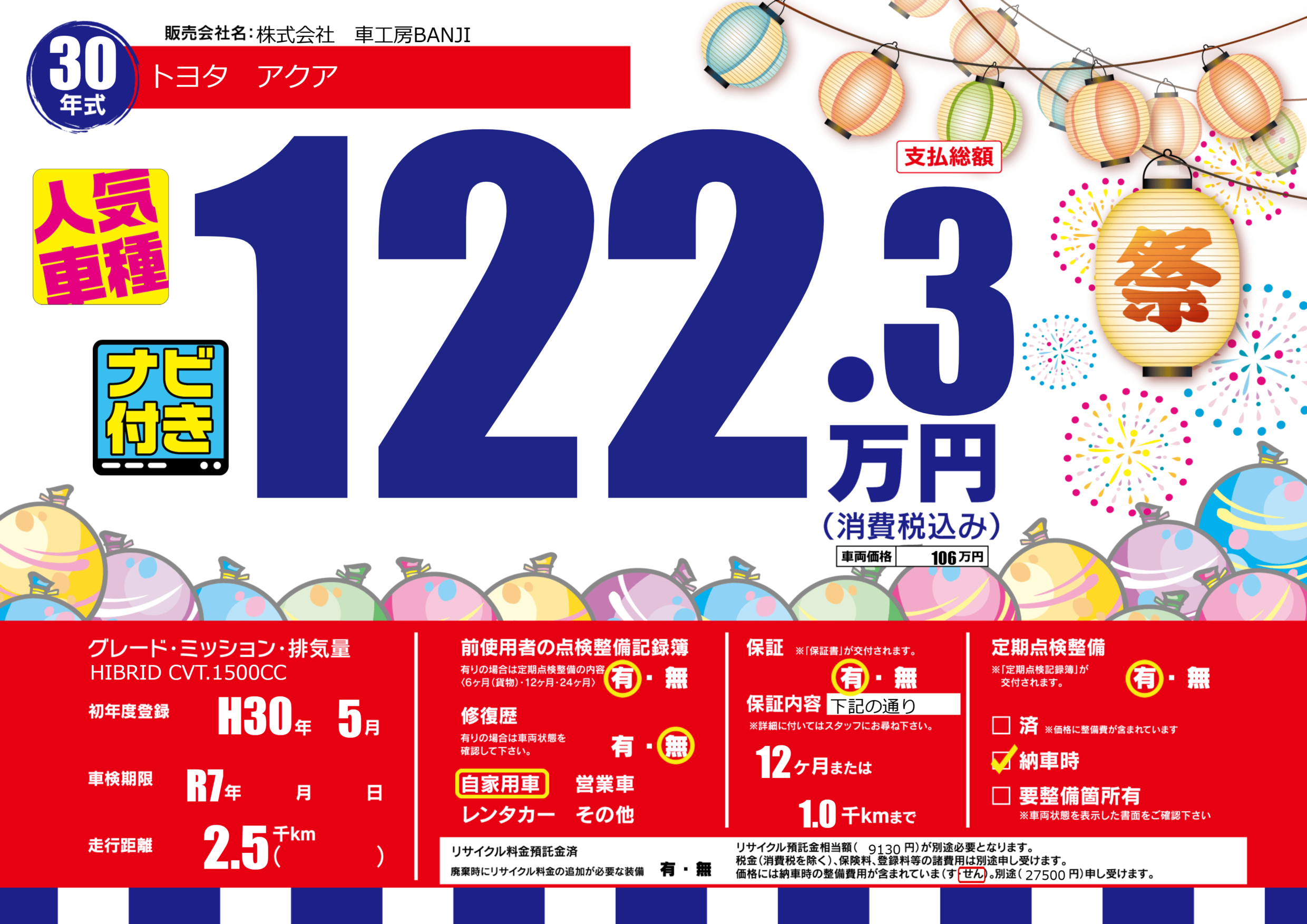 | 車名 | トヨタ アクア | グレード ミッション 排気量 |