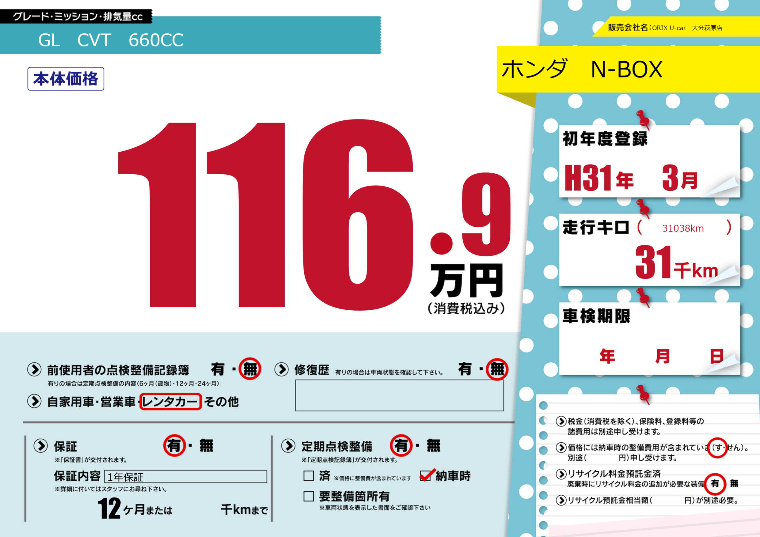 保証付き 保証内容(1年保証) 12ヶ月または()千kmまで |