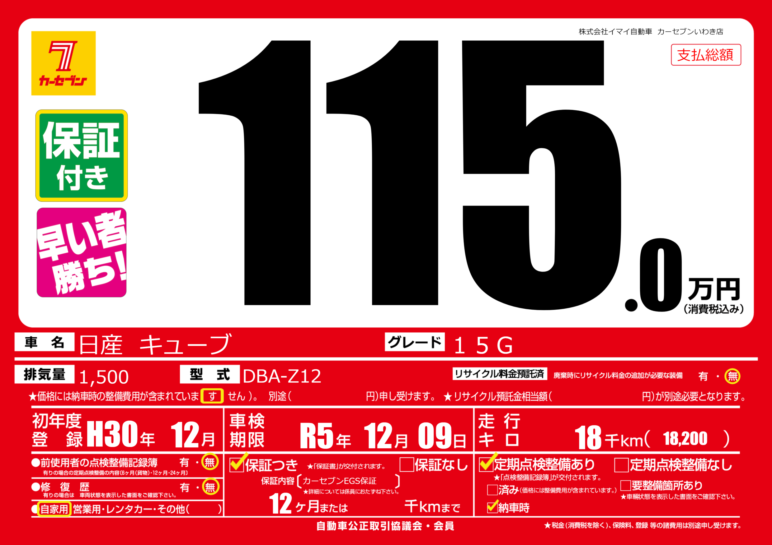 | 車名 | 日産 キューブ | グレード ミッション 排気量 |