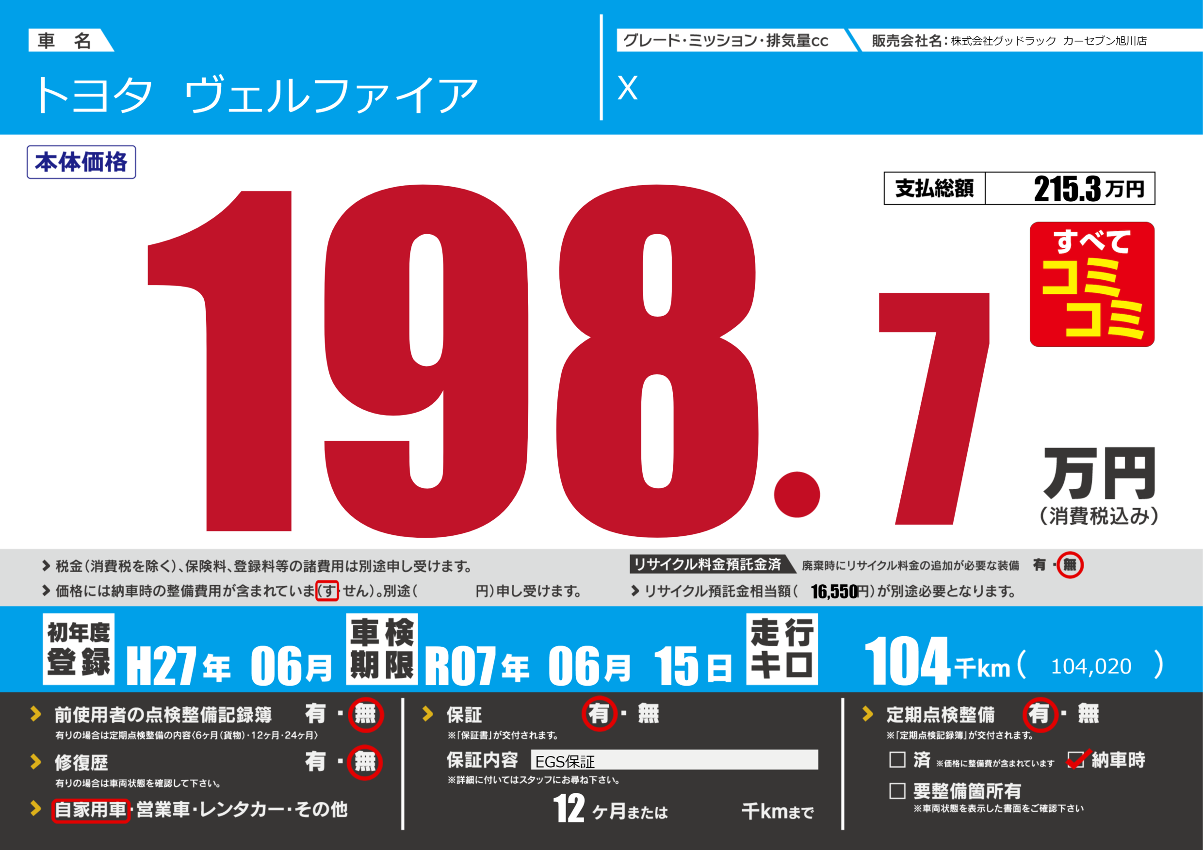 | 車検制限 | R07年 06月 15日 | ||