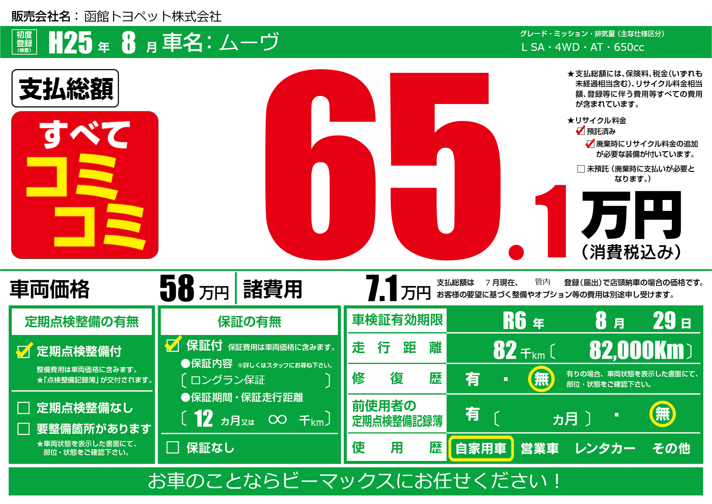 | 走行キロ | 8.2万km | 初年度登録 | H25年8月 |