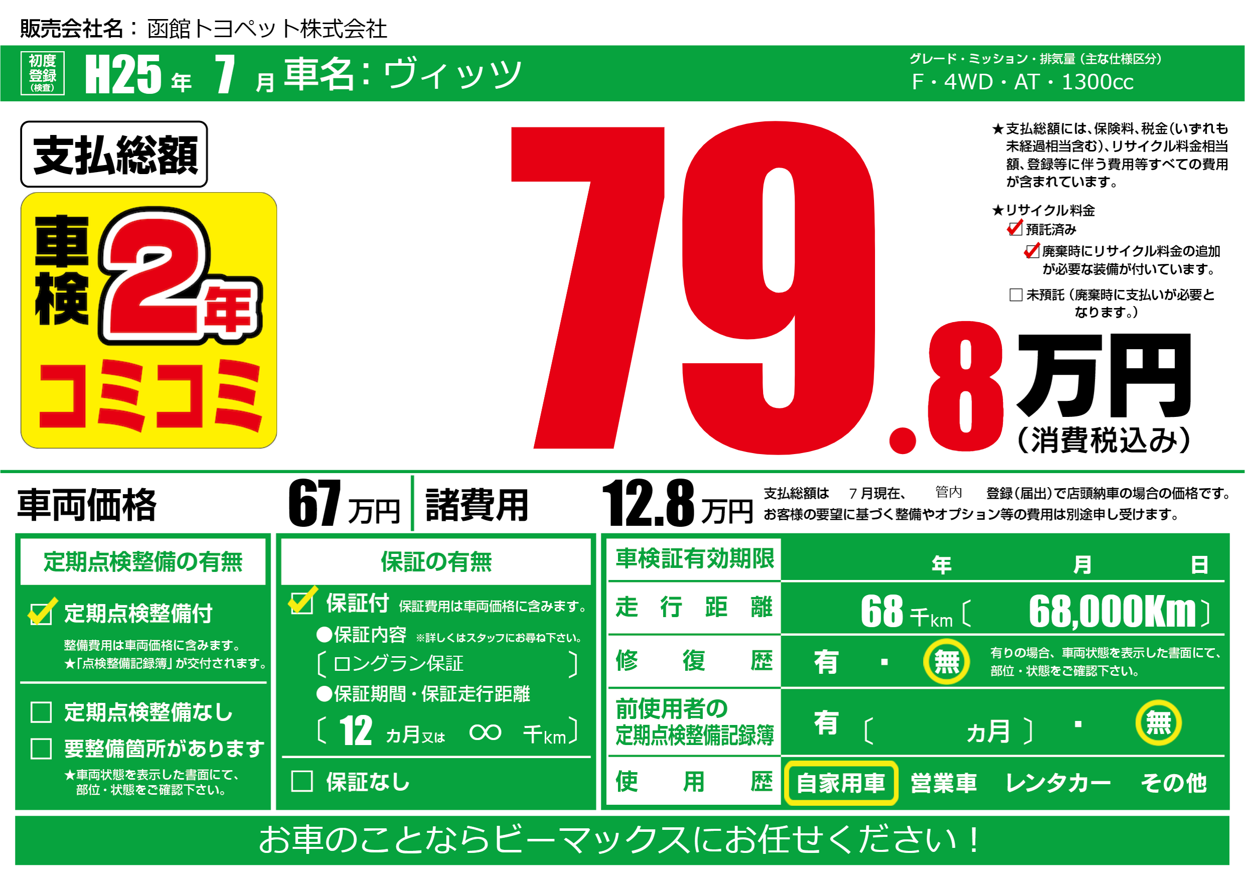 | 車名 | ヴィッツ | グレード ミッション 排気量 |