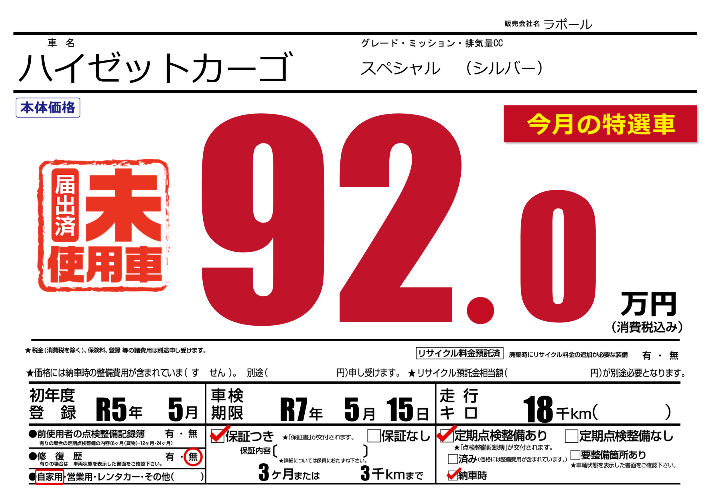 保証付き 保証内容(---) 3ヶ月または(3)千kmまで |