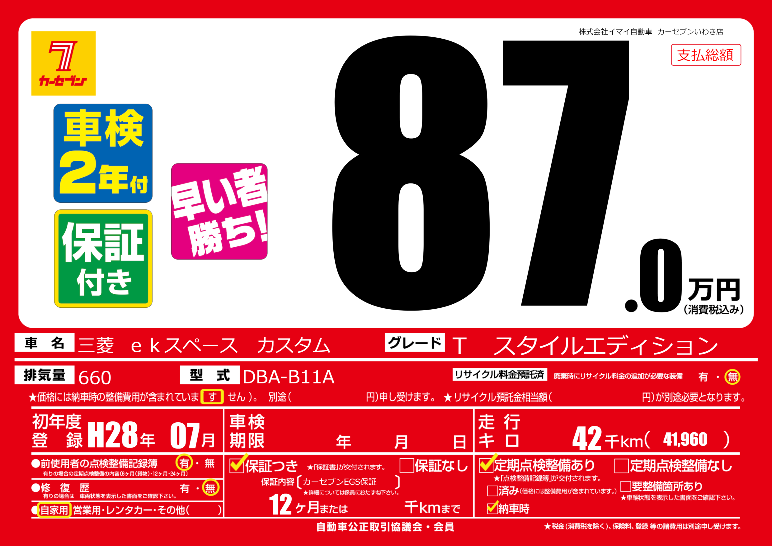 保証付き 保証内容(カーセブンEGS保証) 12ヶ月または千km |
