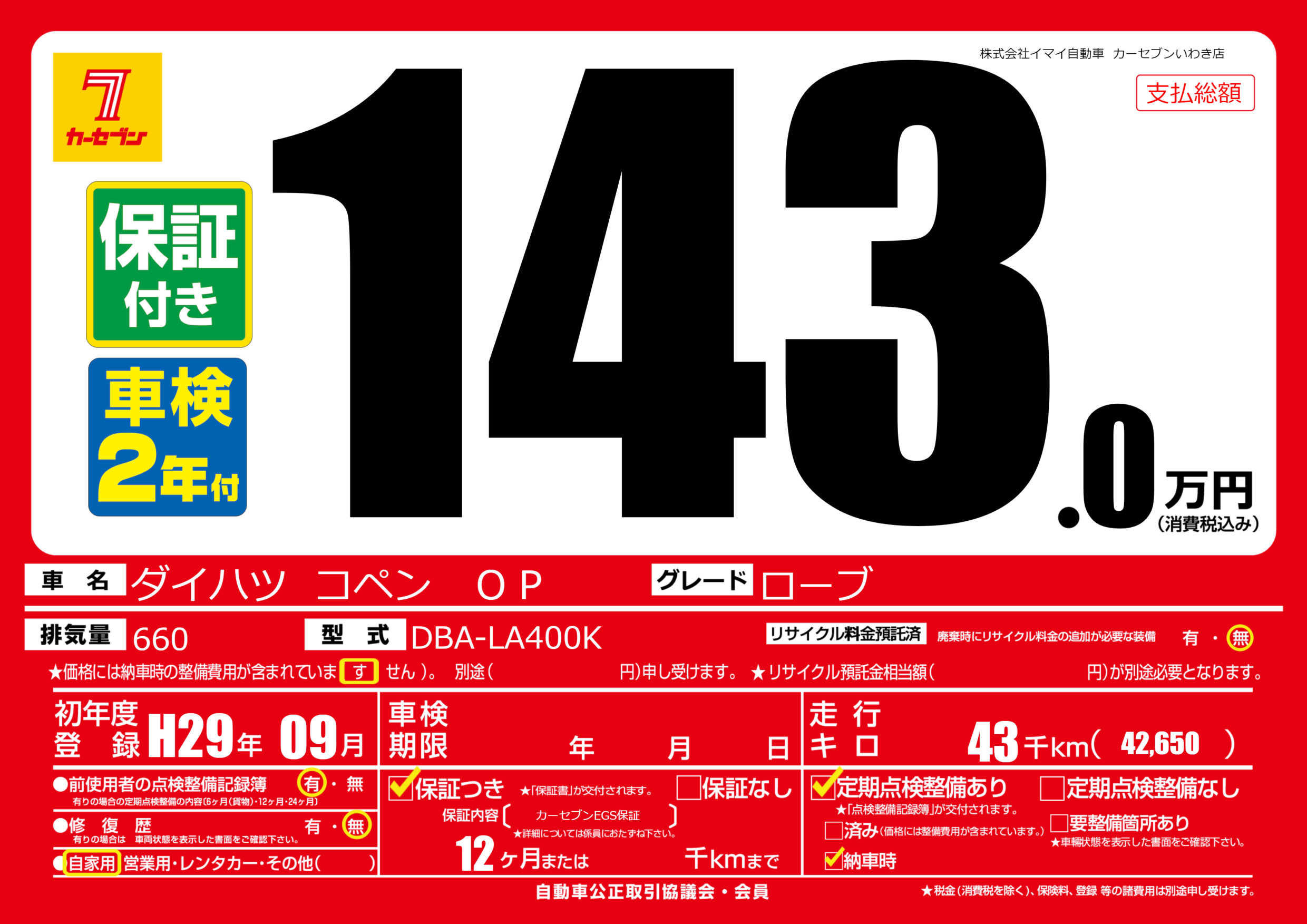 保証付き 保証内容( カーセブンEGS保証) 12ヶ月または千km |