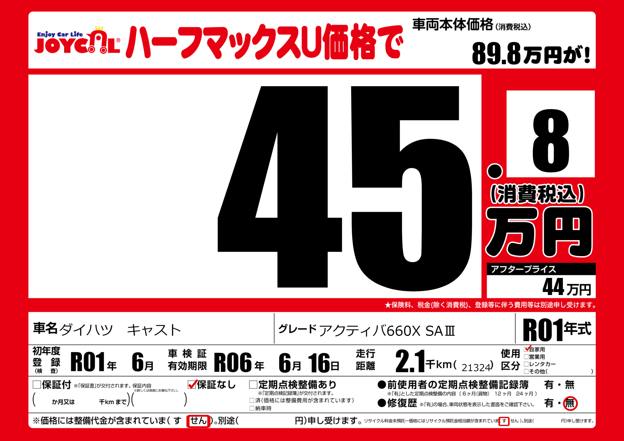 | 車名 | ダイハツ キャスト | グレード ミッション 排気量 |