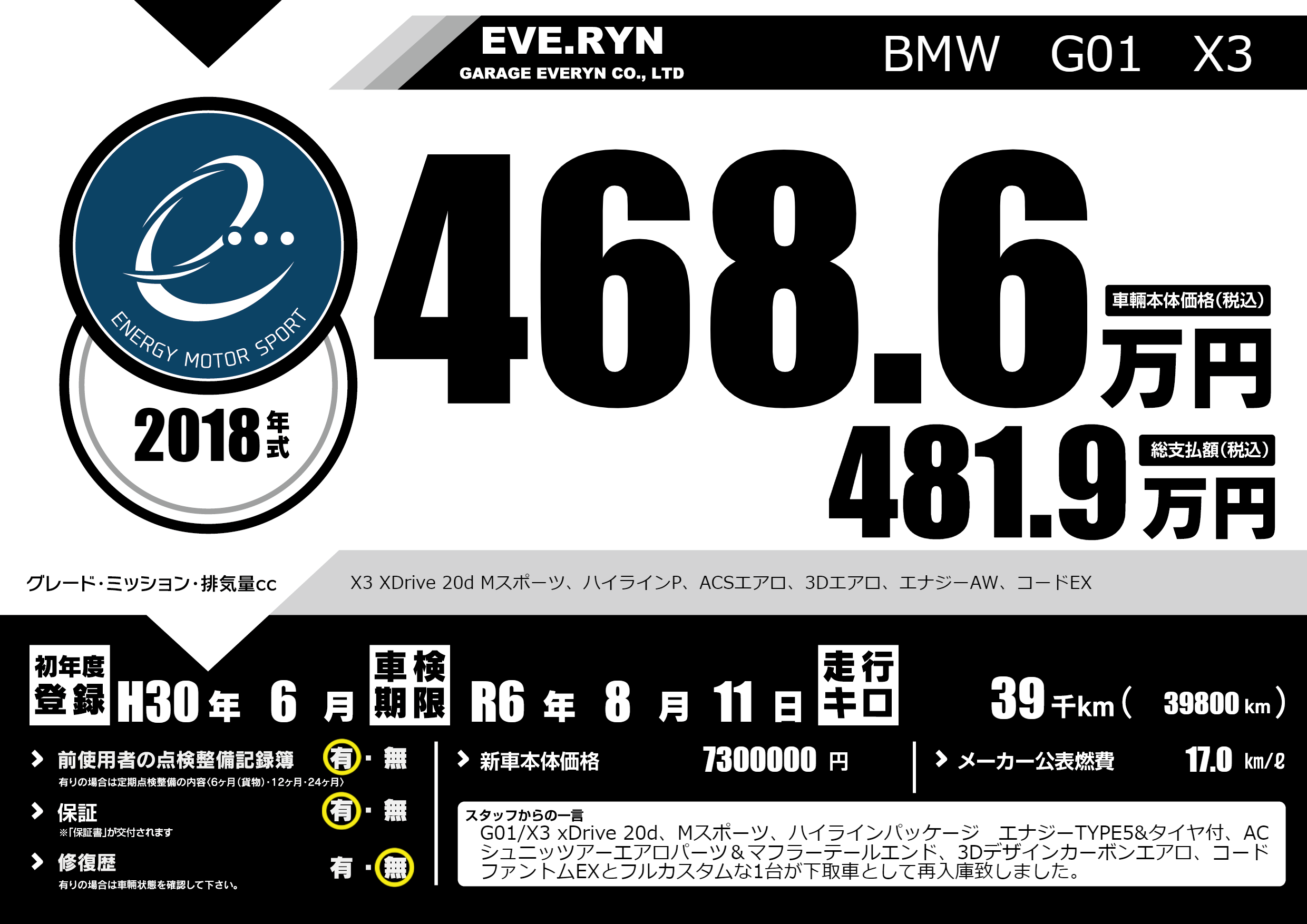 | 車名 | BMW G01 X3 | グレード ミッション 排気量 |