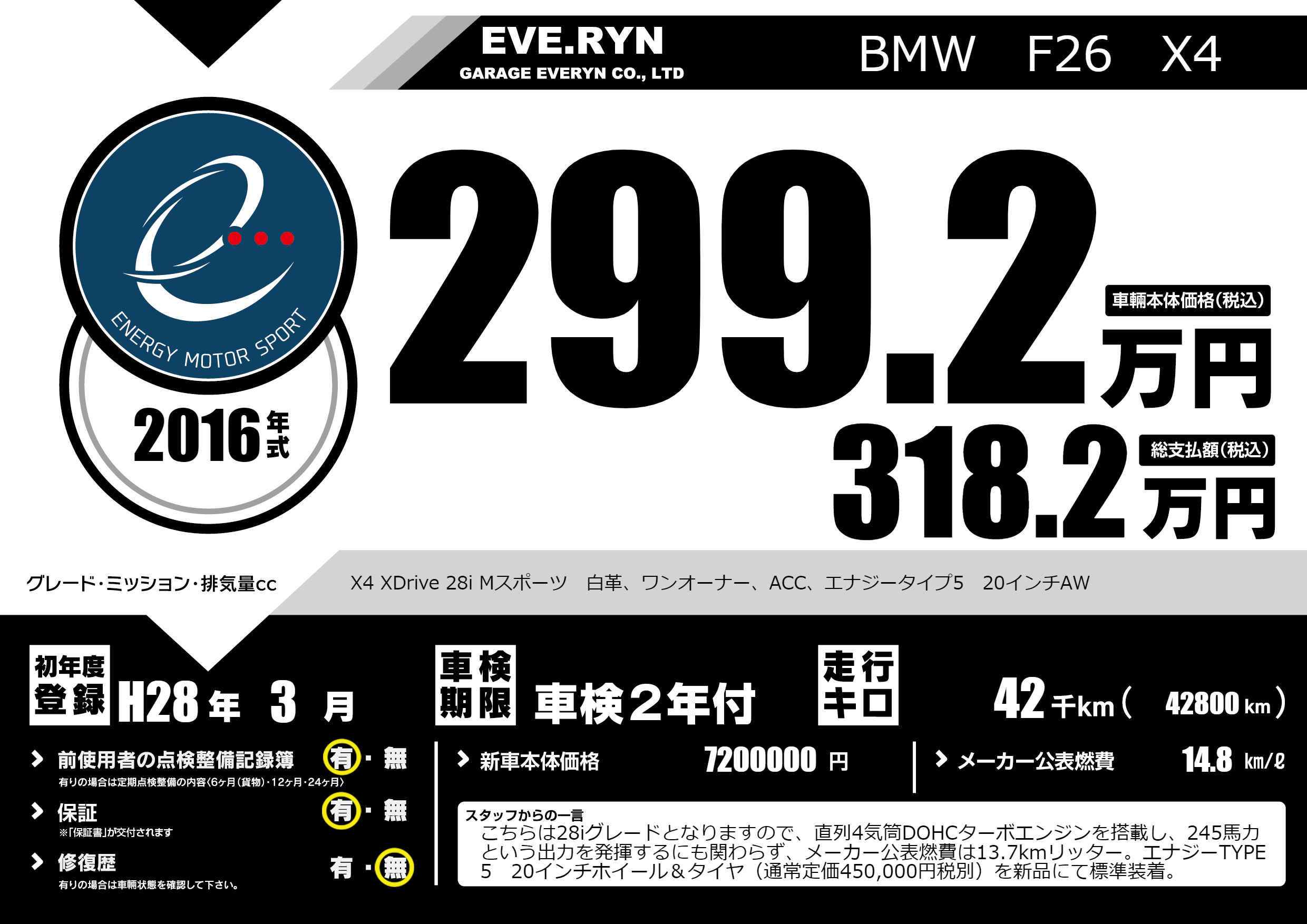 | 車名 | BMW F26 X4 | グレード ミッション 排気量 |