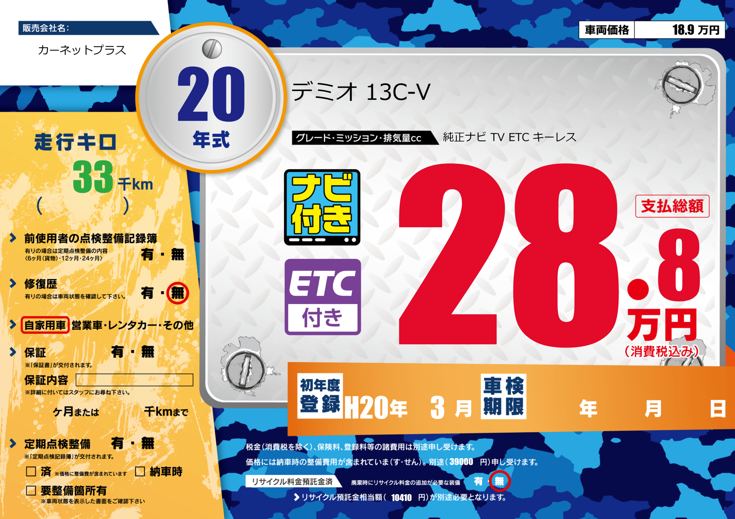 | 車名 | デミオ 13C-V | グレード ミッション 排気量 |