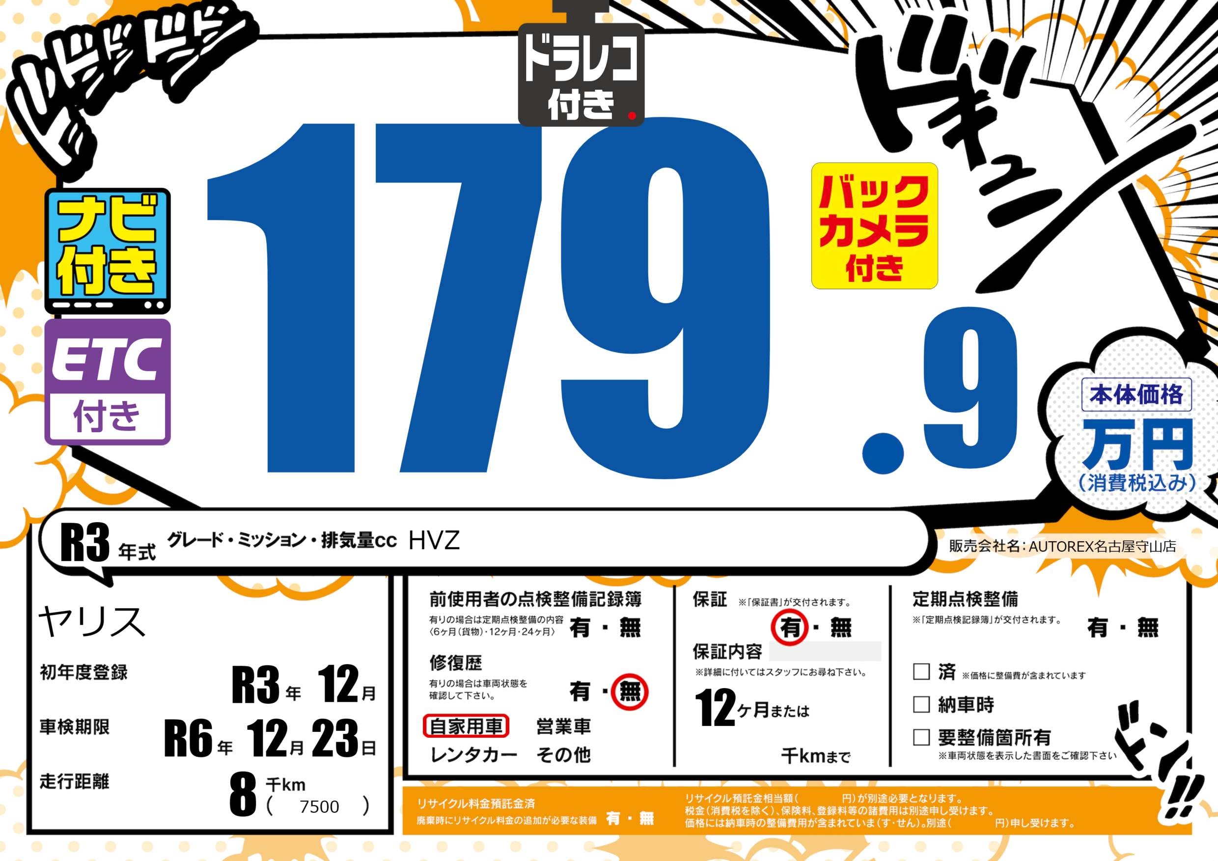 | 走行キロ | 0.8万km | 初年度登録 | R3年12月 |