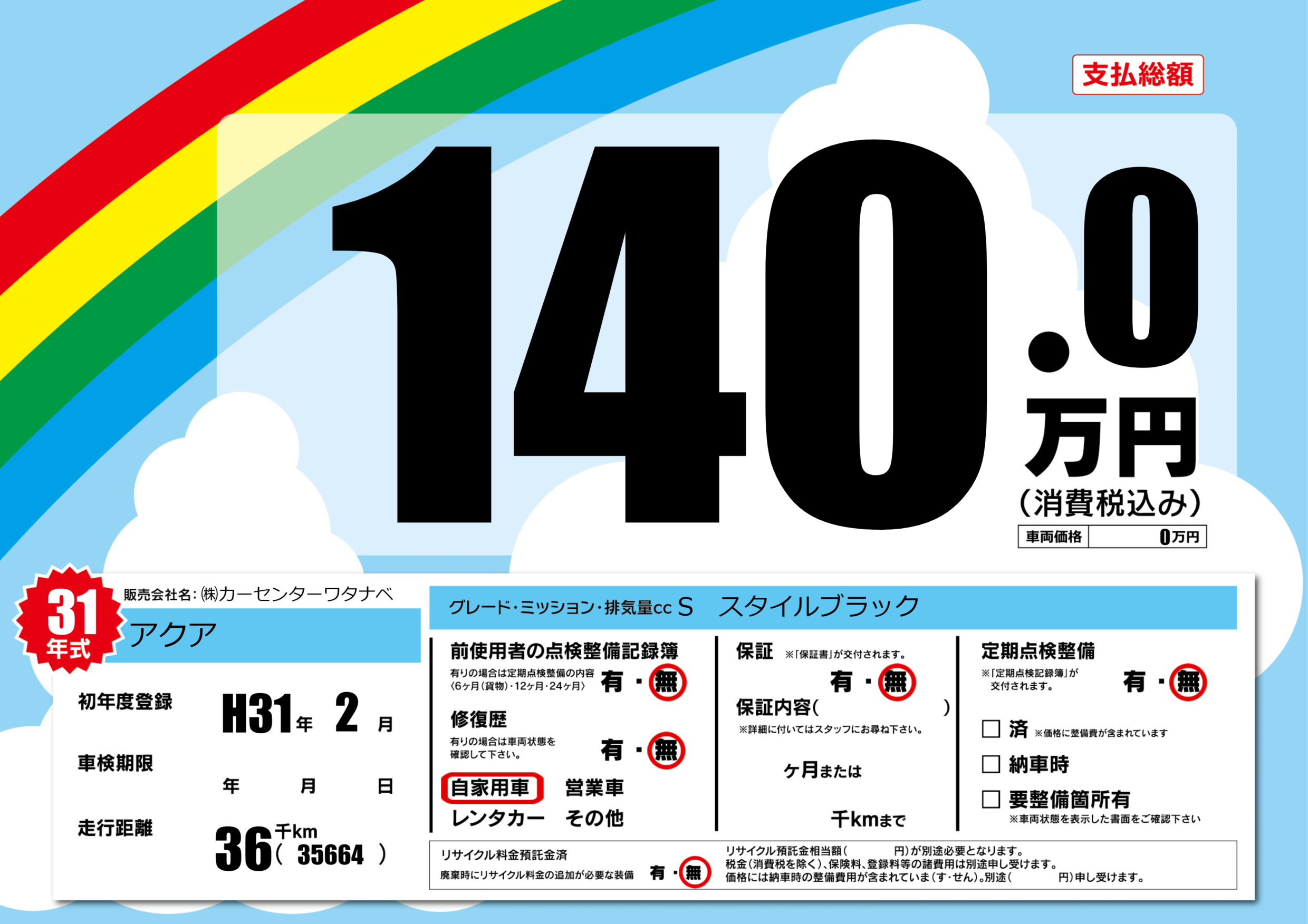 | 走行キロ | 3.6万km | 初年度登録 | H31年2月 |