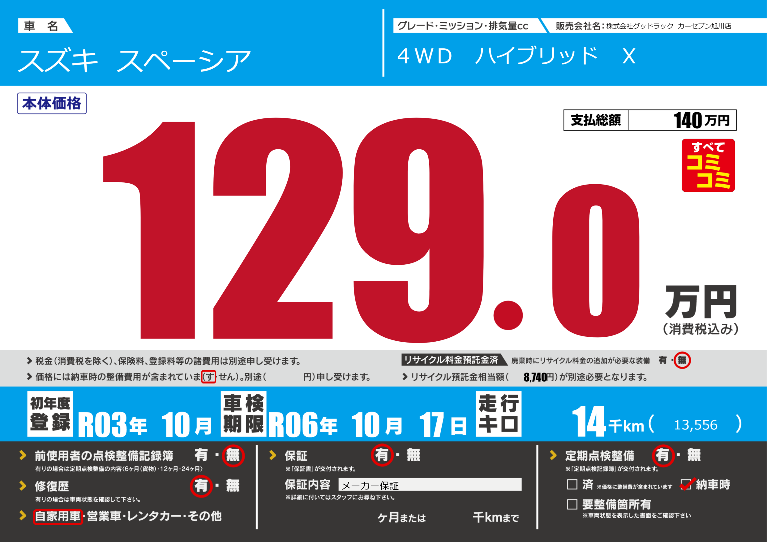 | 走行キロ | 1.4万km | 初年度登録 | R03年10月 |