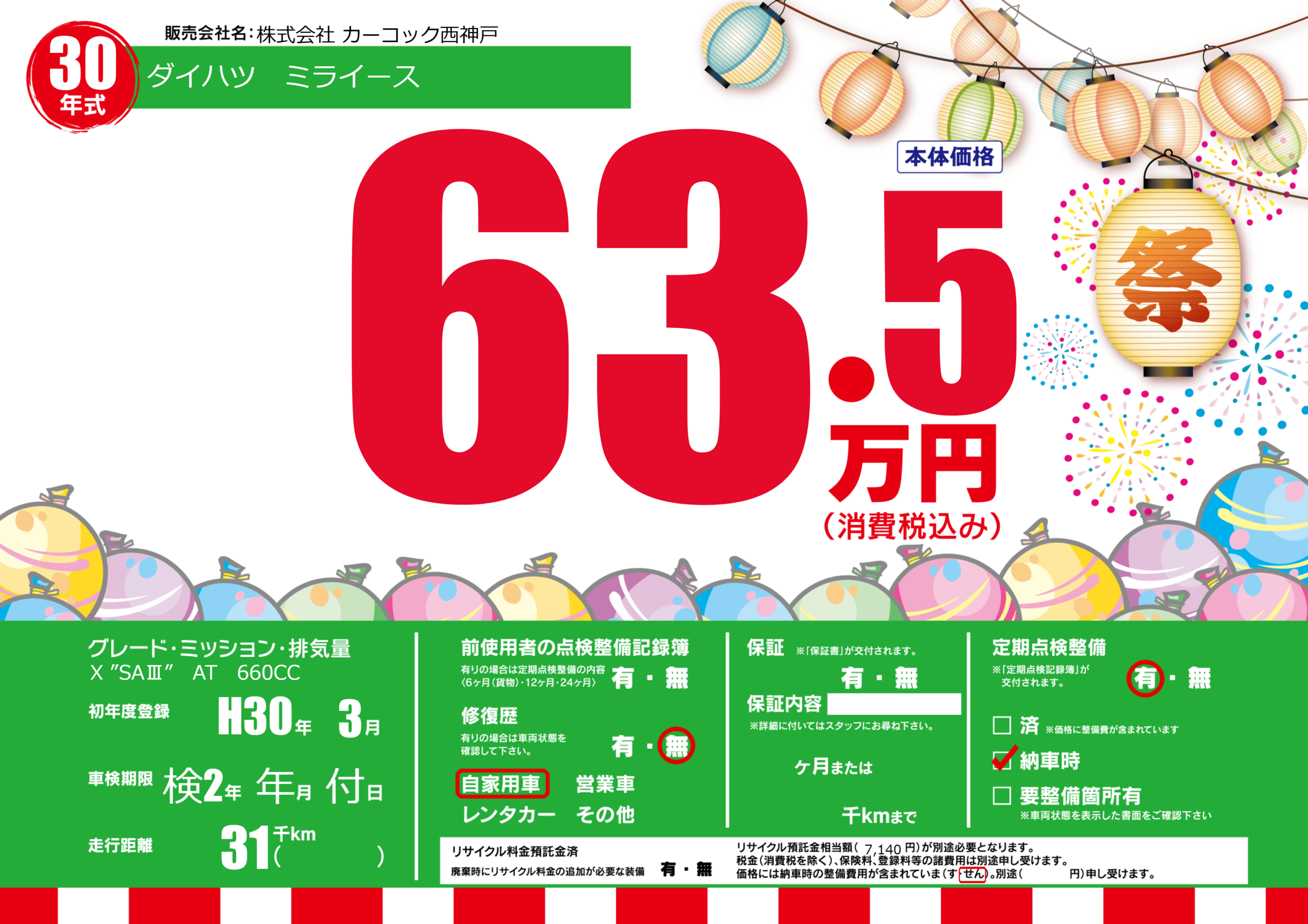 | 走行キロ | 3.1万km | 初年度登録 | H30年3月 |