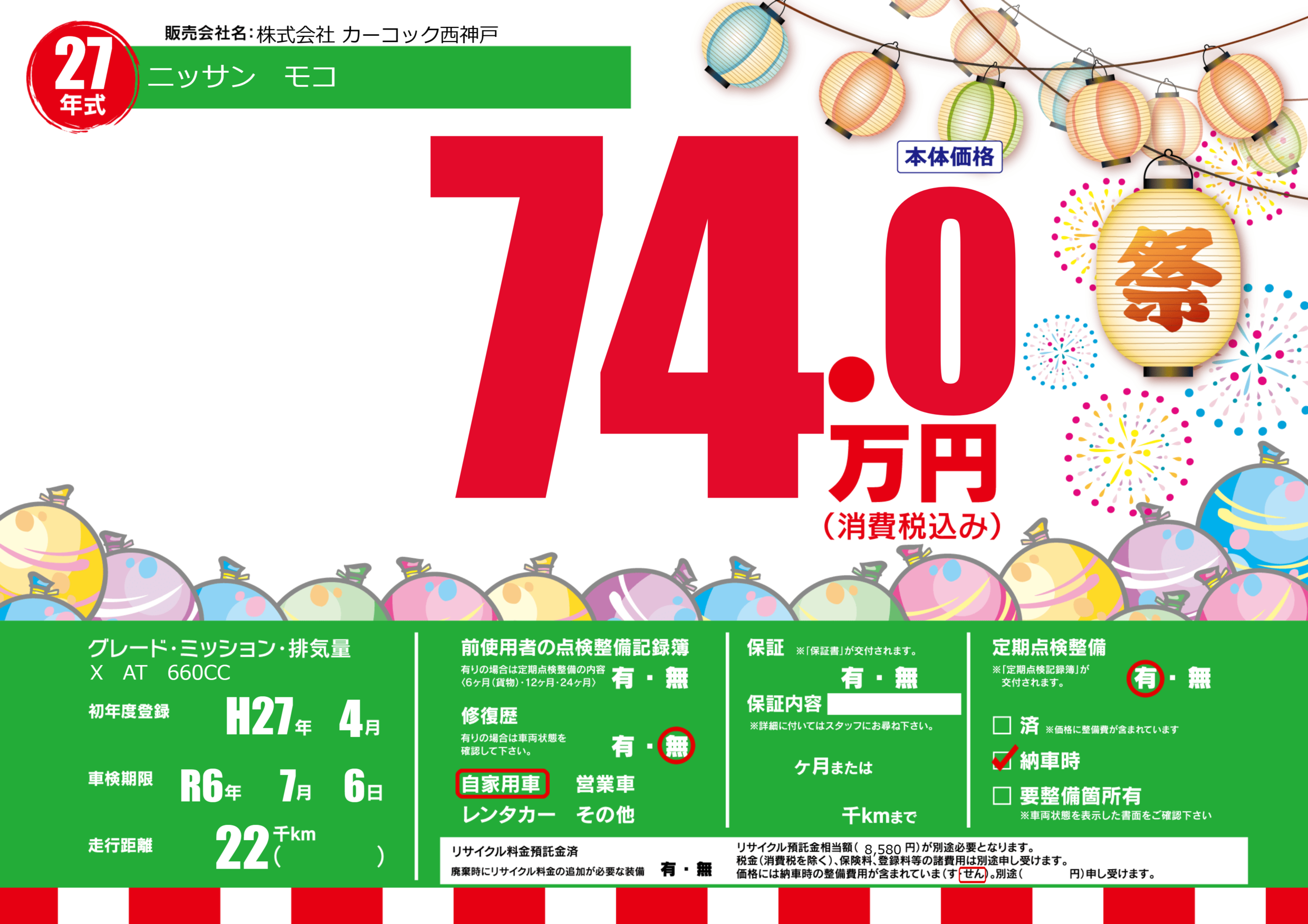 | 定期点検整備 | 定期点検整備あり 納車時あり | ||