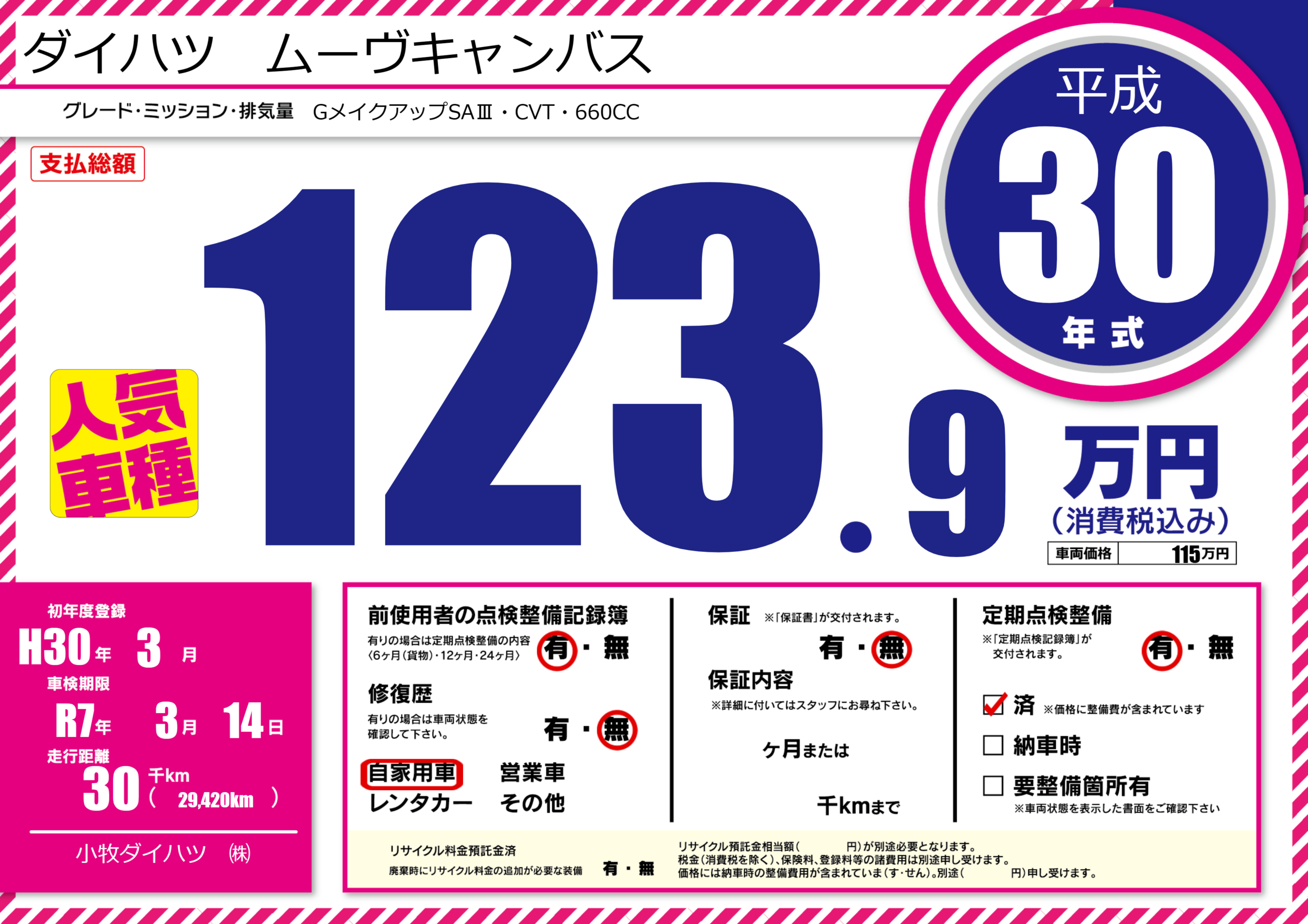 | 走行キロ | 3万km | 初年度登録 | H30年3月 |