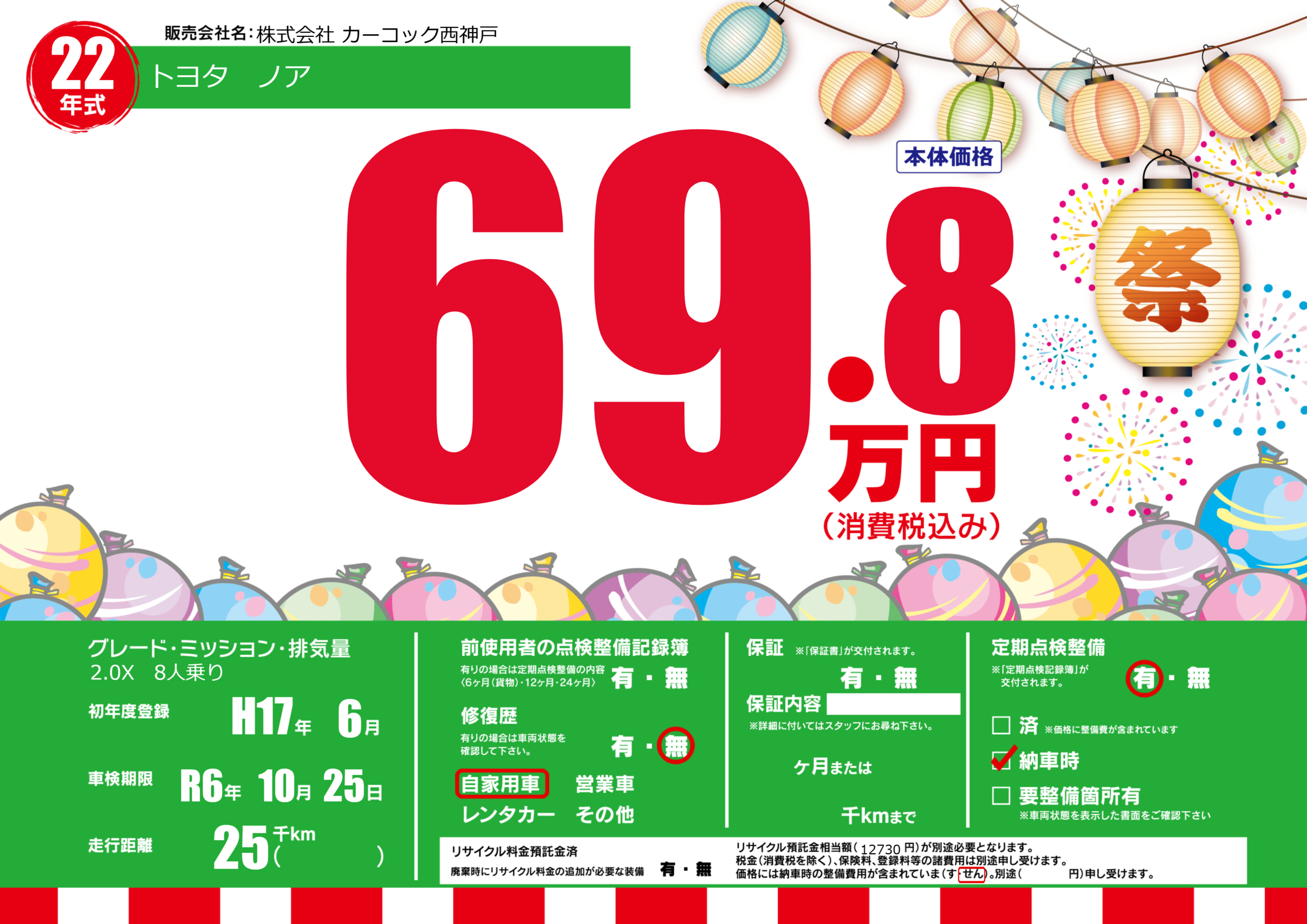 | 車名 | トヨタ ノア | グレード ミッション 排気量 |
