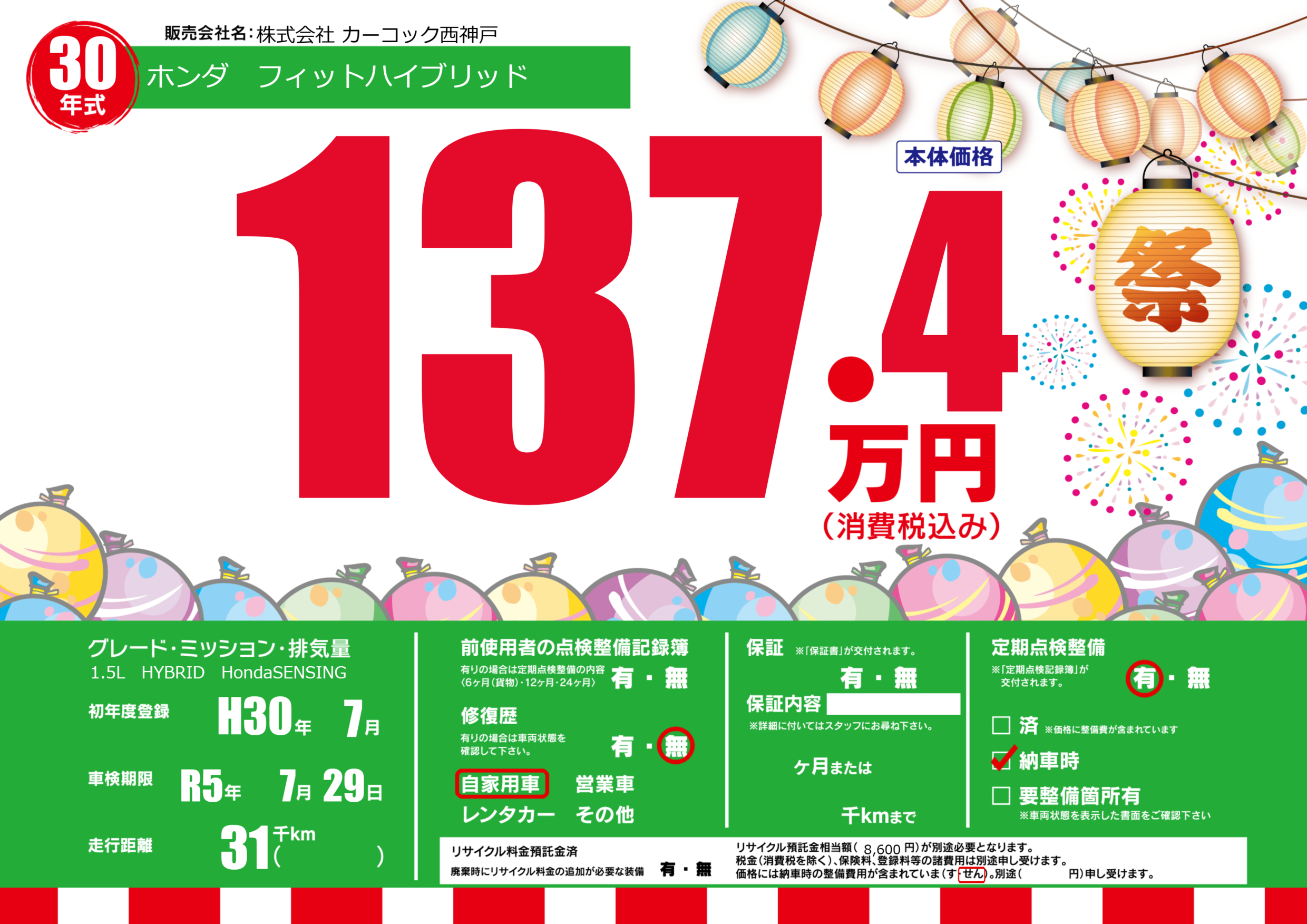| 車名 | ホンダ フィットハイブリッド | グレード ミッション 排気量 |