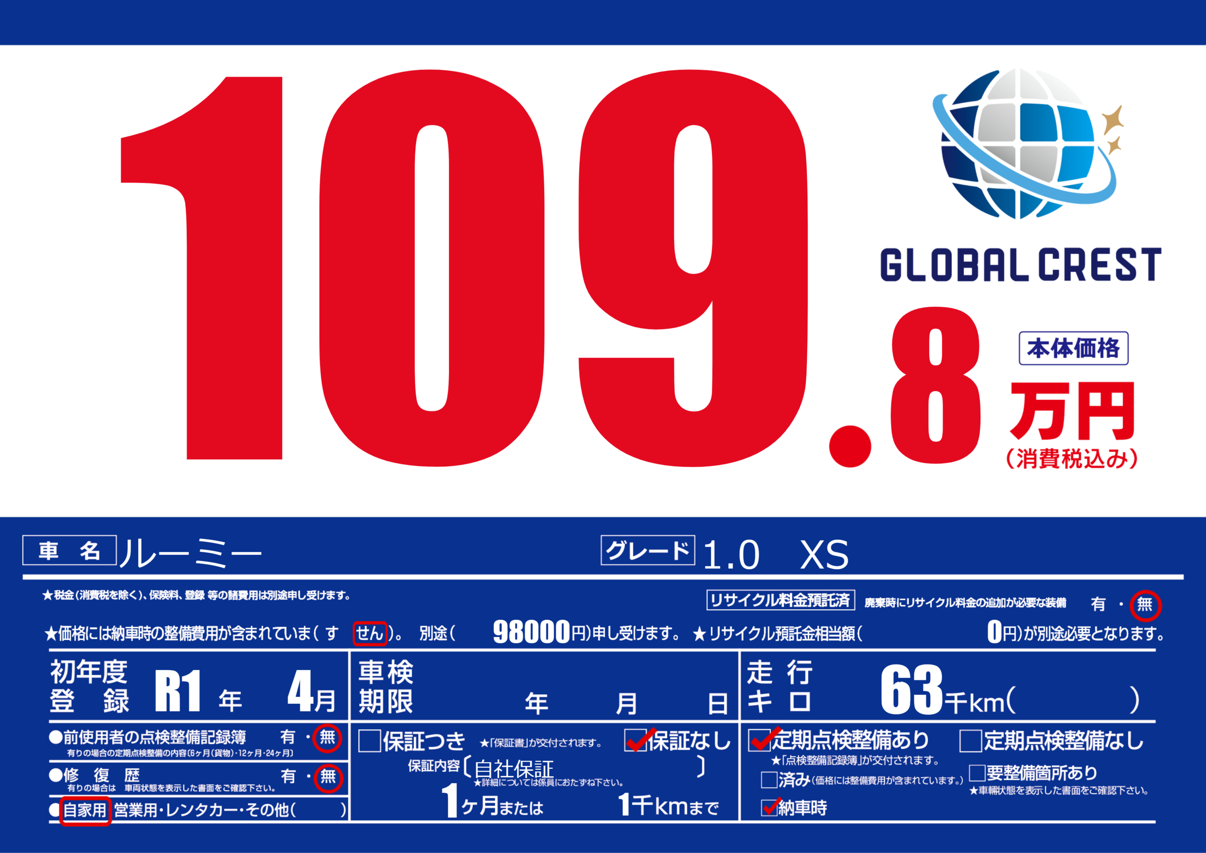 | 車名 | ルーミー | グレード ミッション 排気量 |
