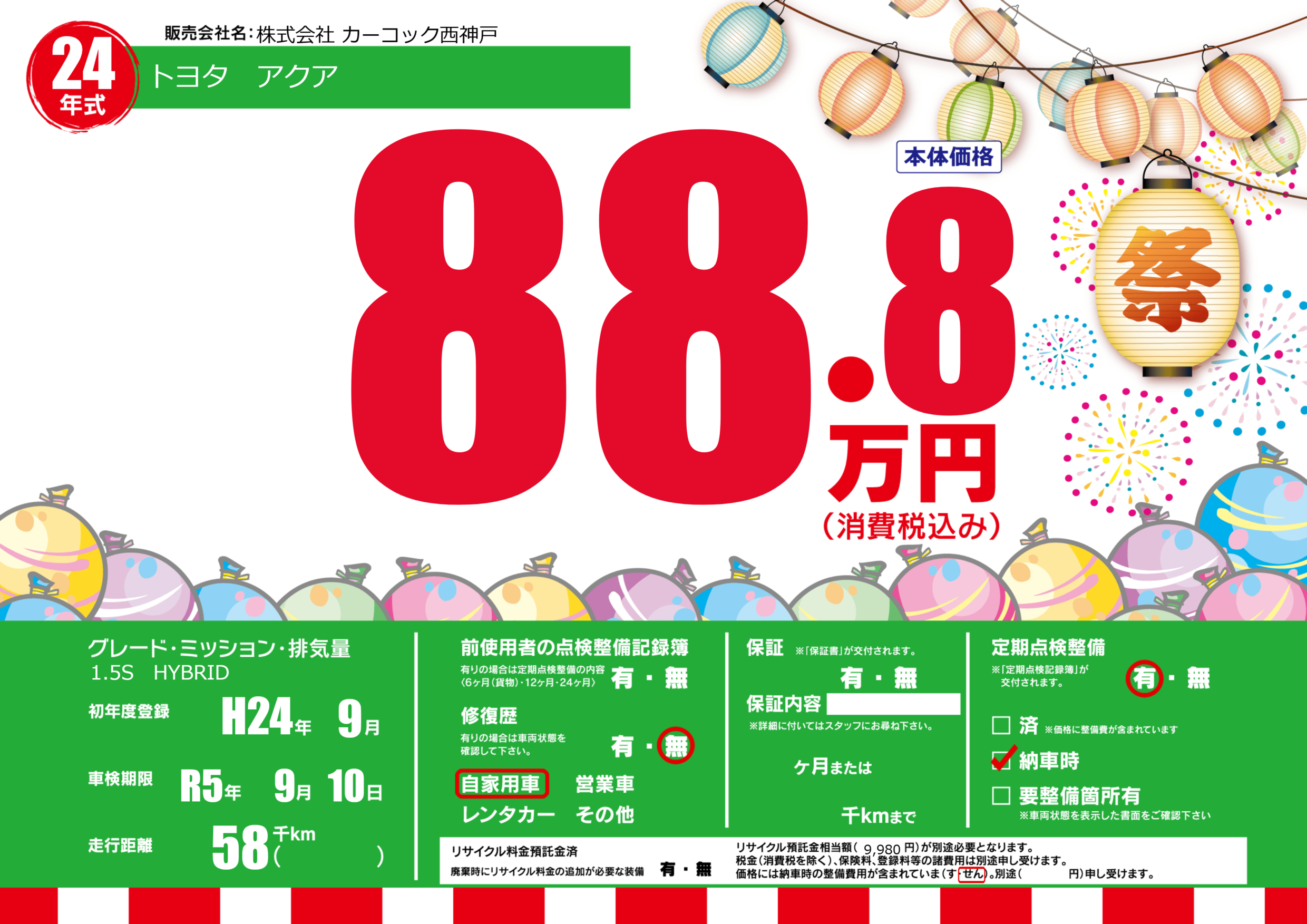 | 車名 | トヨタ アクア | グレード ミッション 排気量 |