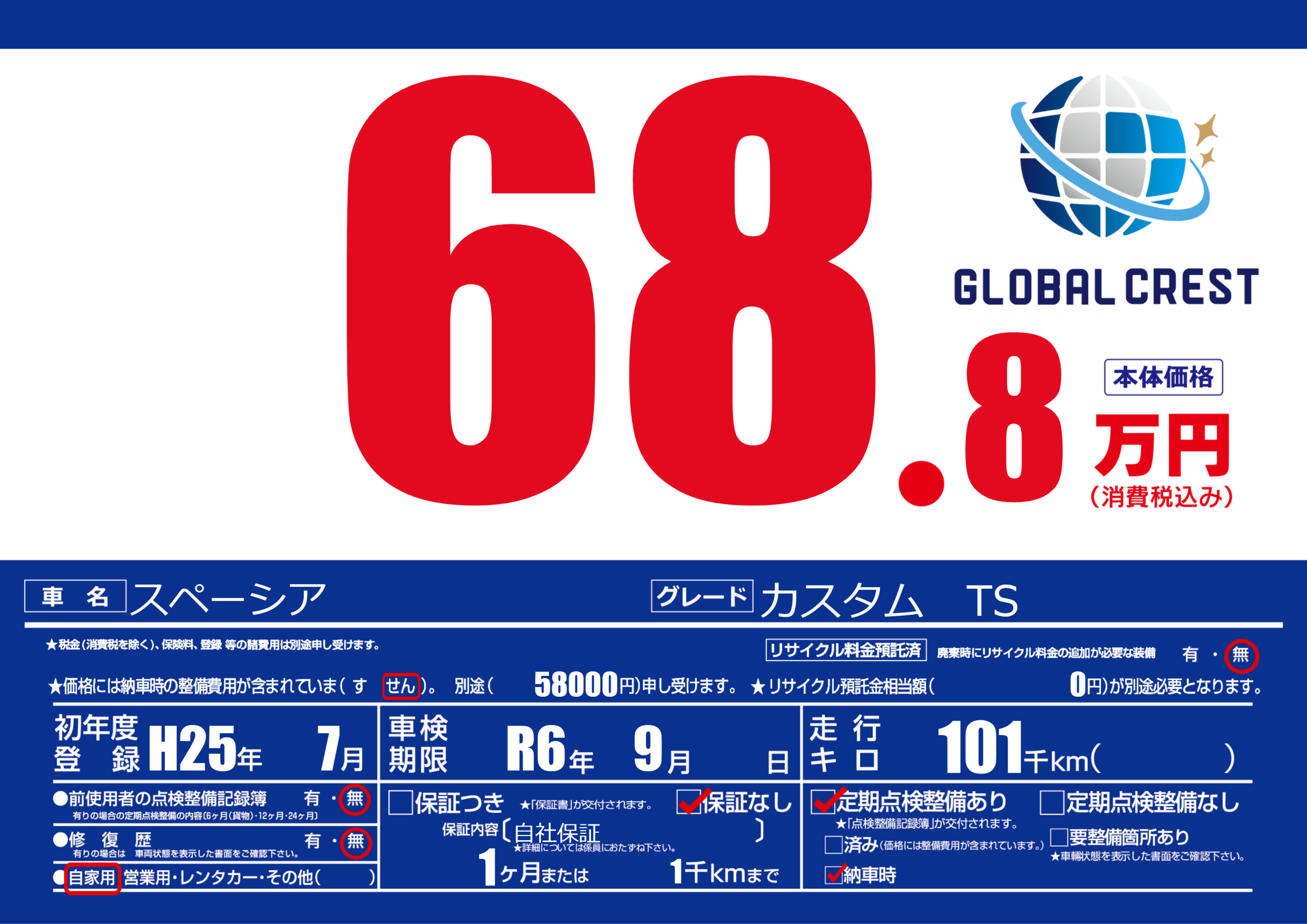 | 車名 | スペーシア | グレード ミッション 排気量 |