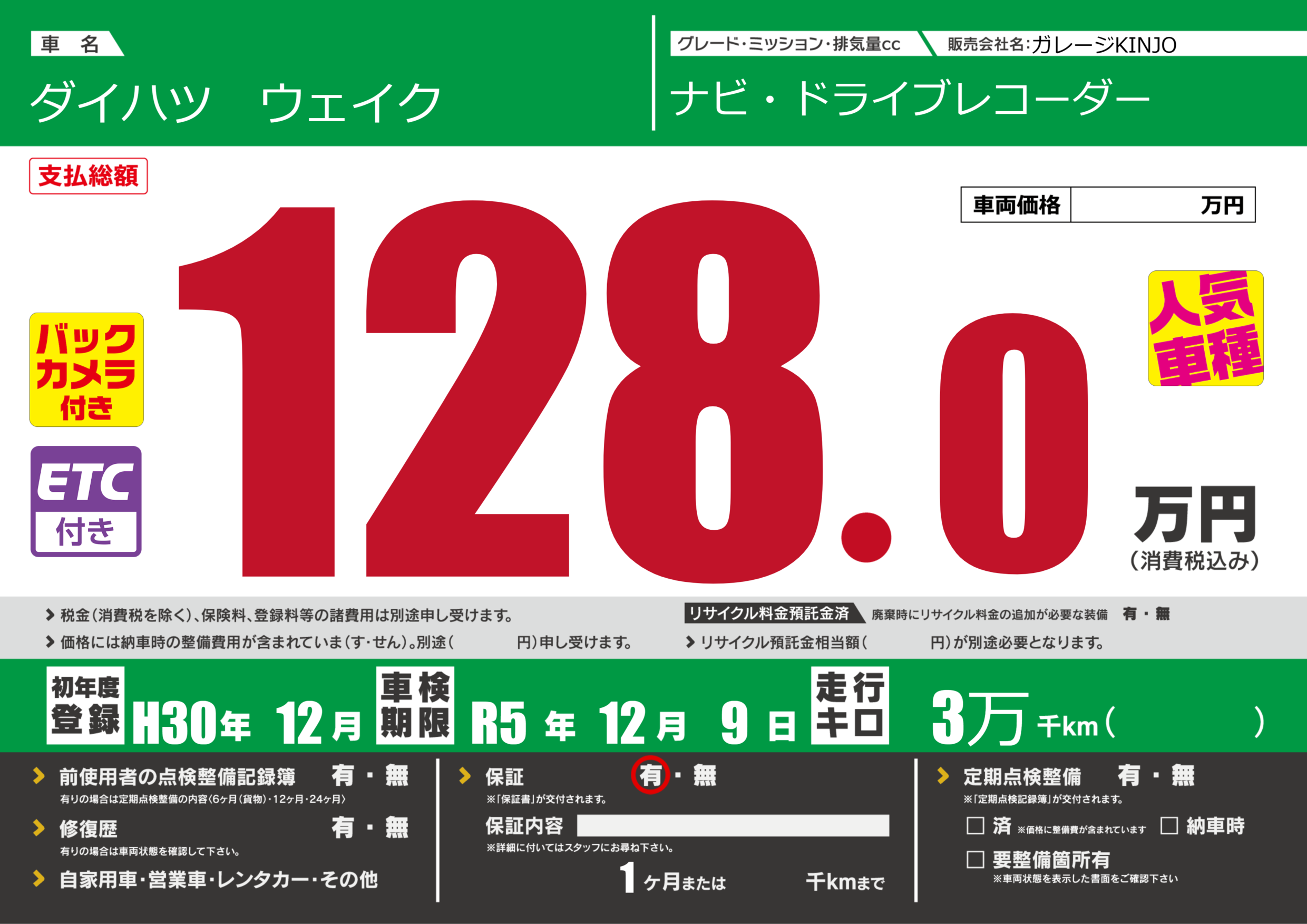 保証付き 保証内容(---) 1ヶ月または()千kmまで |