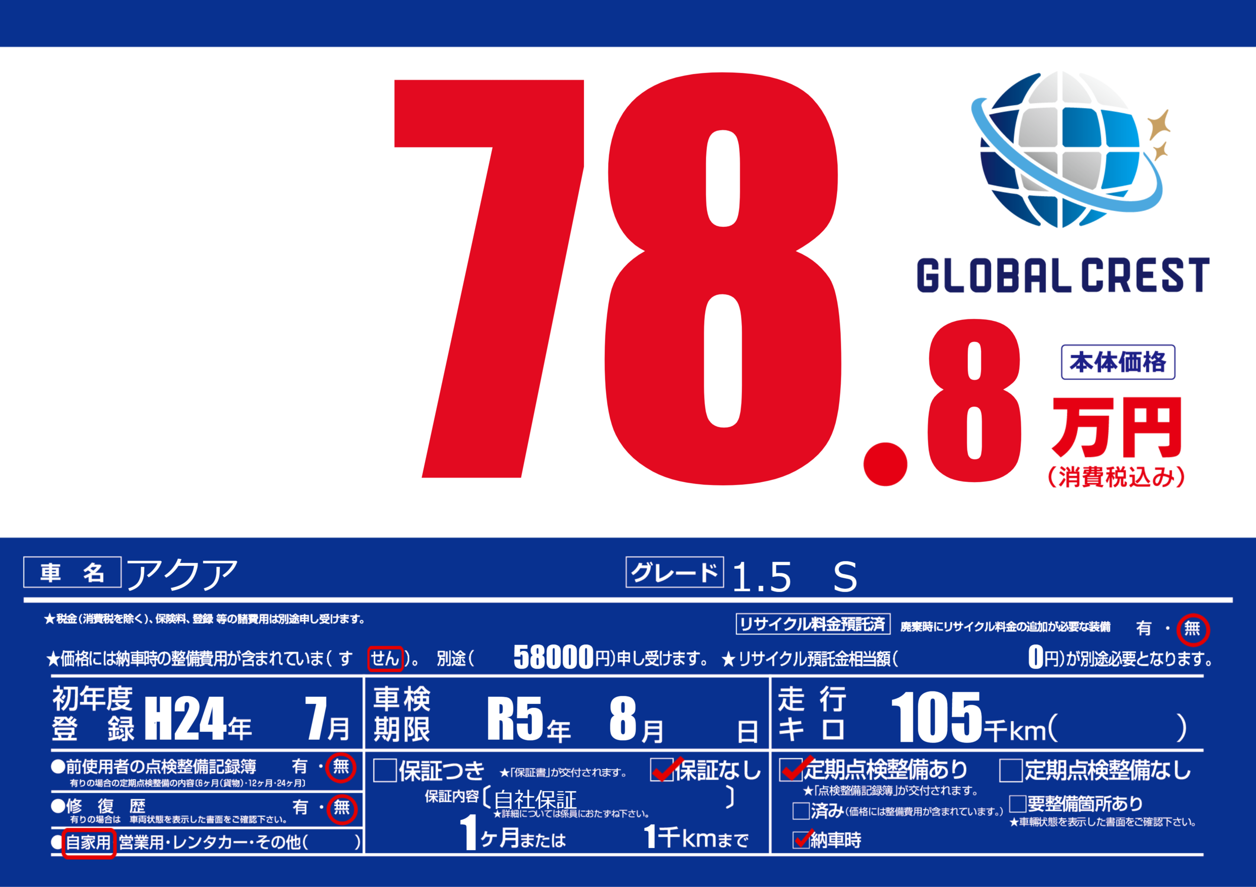 | 走行キロ | 10.5万km | 初年度登録 | H24年7月 |