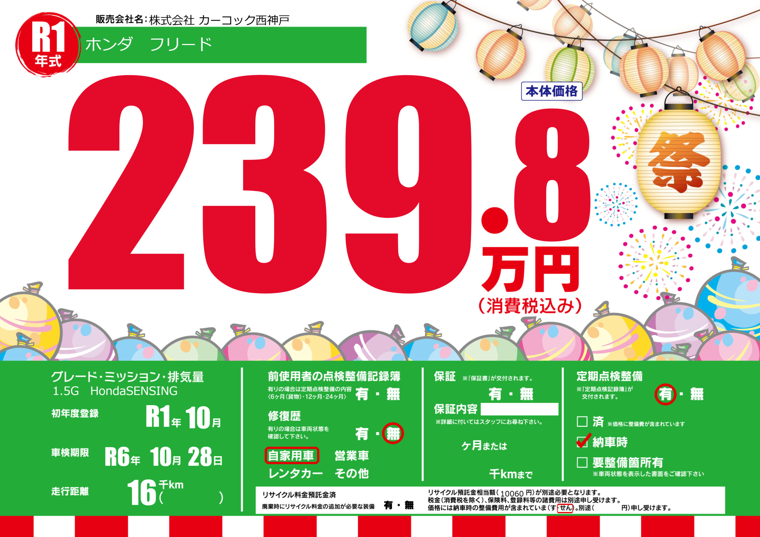 | 車名 | ホンダ フリード | グレード ミッション 排気量 |