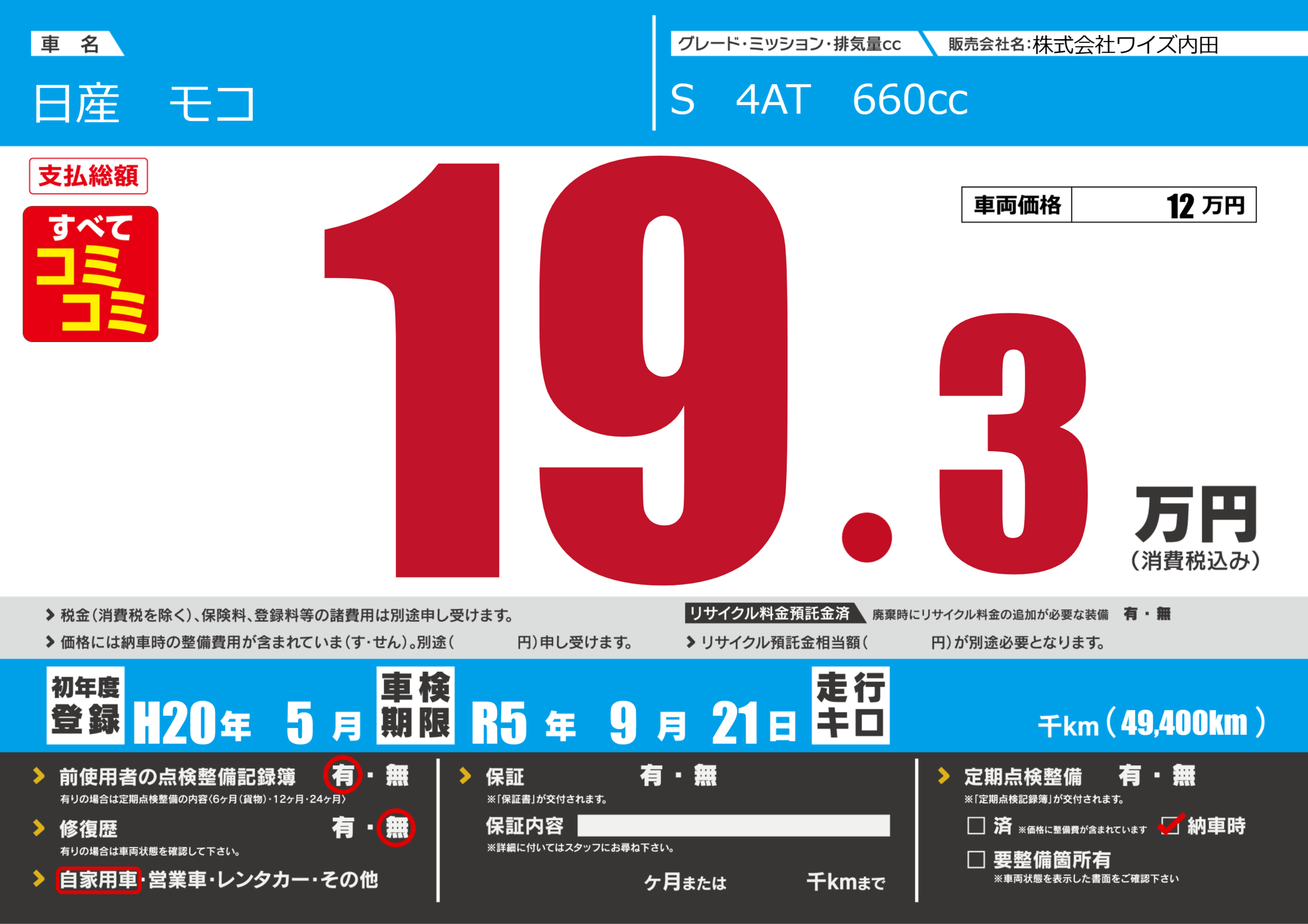 | 車名 | 日産 モコ | グレード ミッション 排気量 |