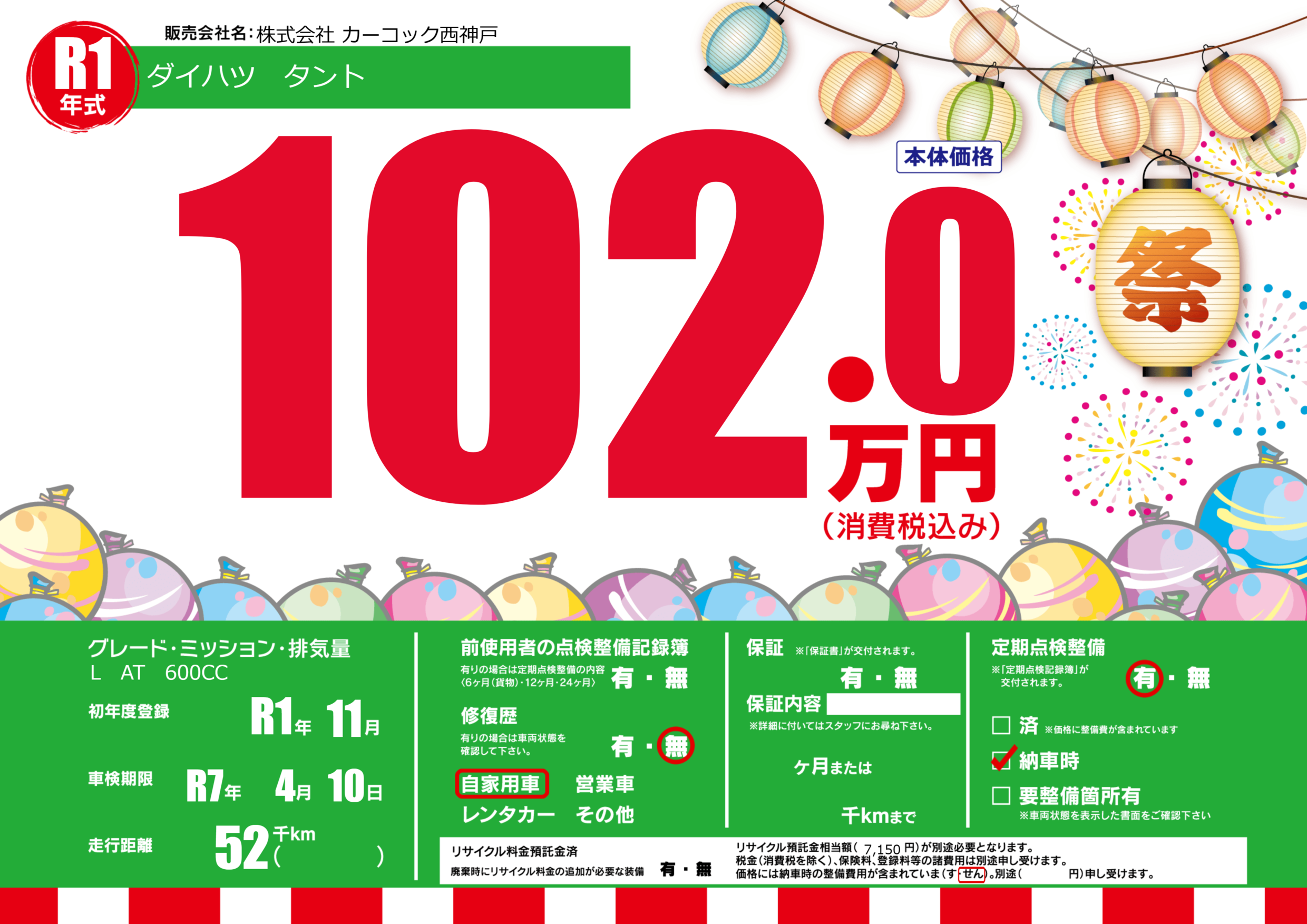 | 車名 | ダイハツ タント | グレード ミッション 排気量 |