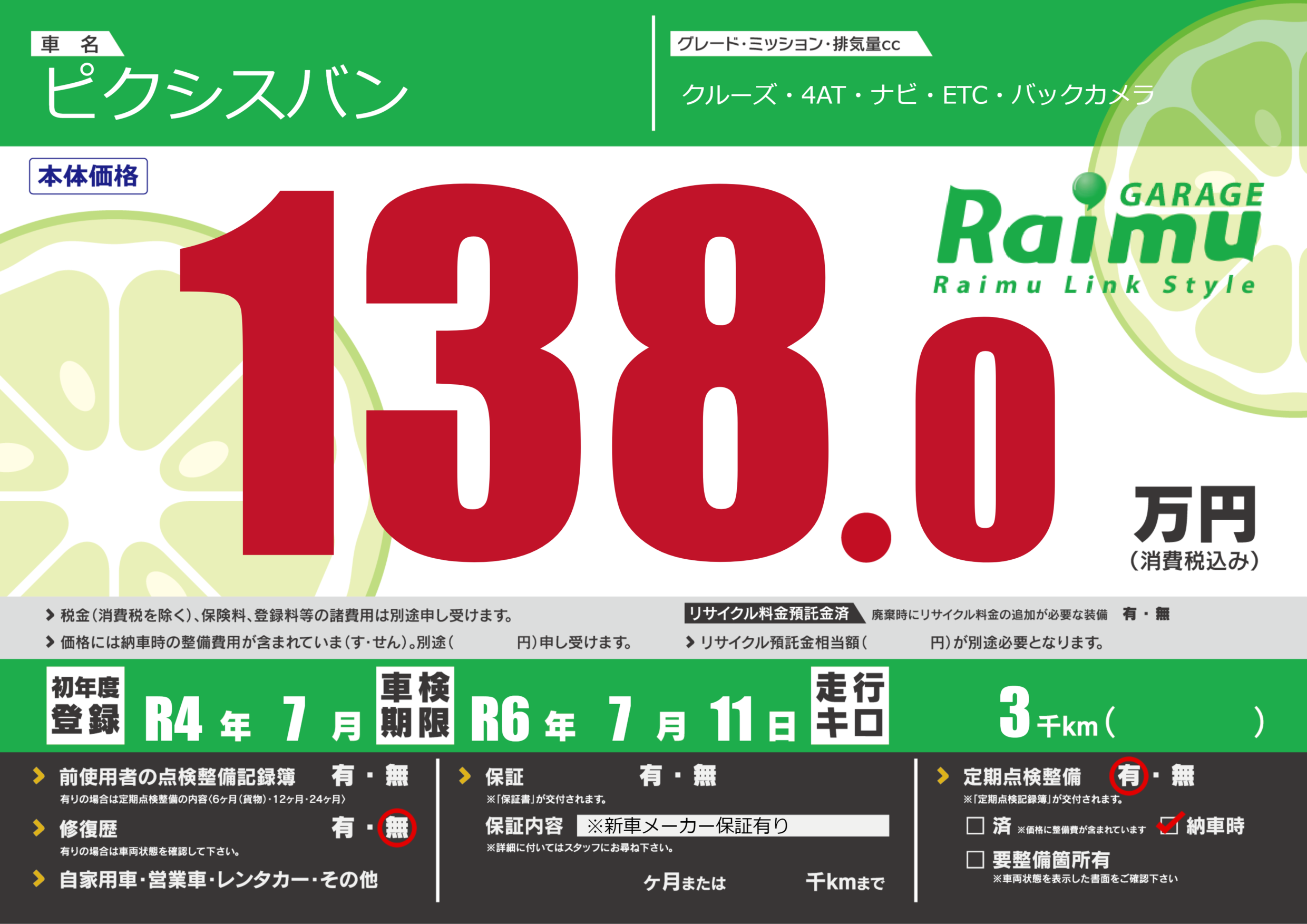 | 走行キロ | 0.3万km | 初年度登録 | R4年7月 |
