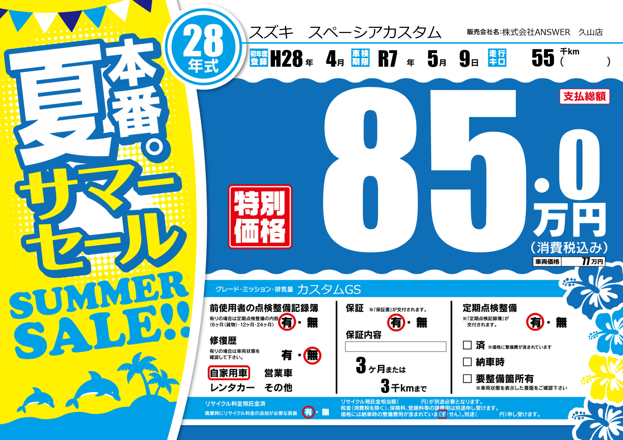 | 走行キロ | 5.5万km | 初年度登録 | H28年4月 |