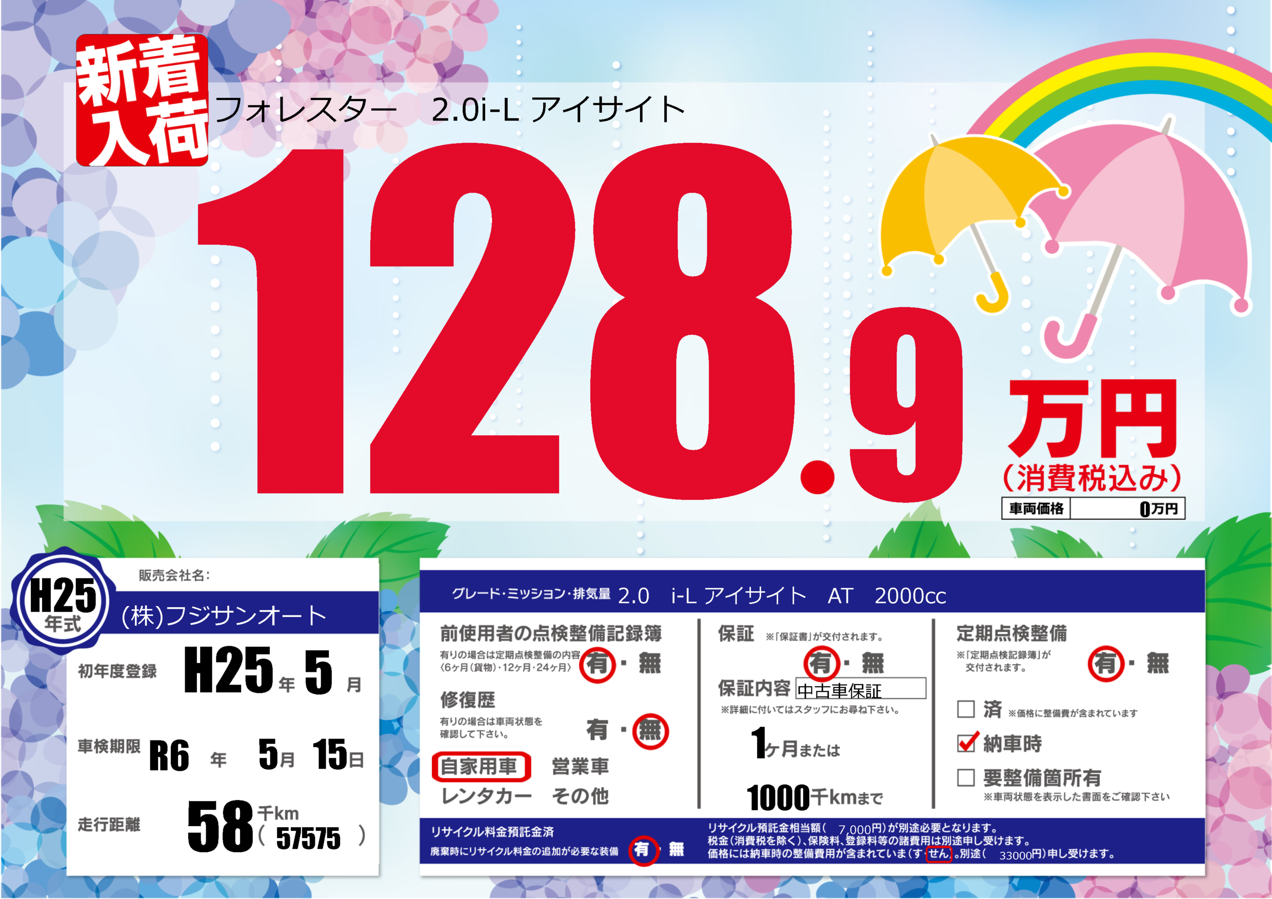 | 車名 | フォレスター 2.0i-L アイサイト | グレード ミッション 排気量 |
