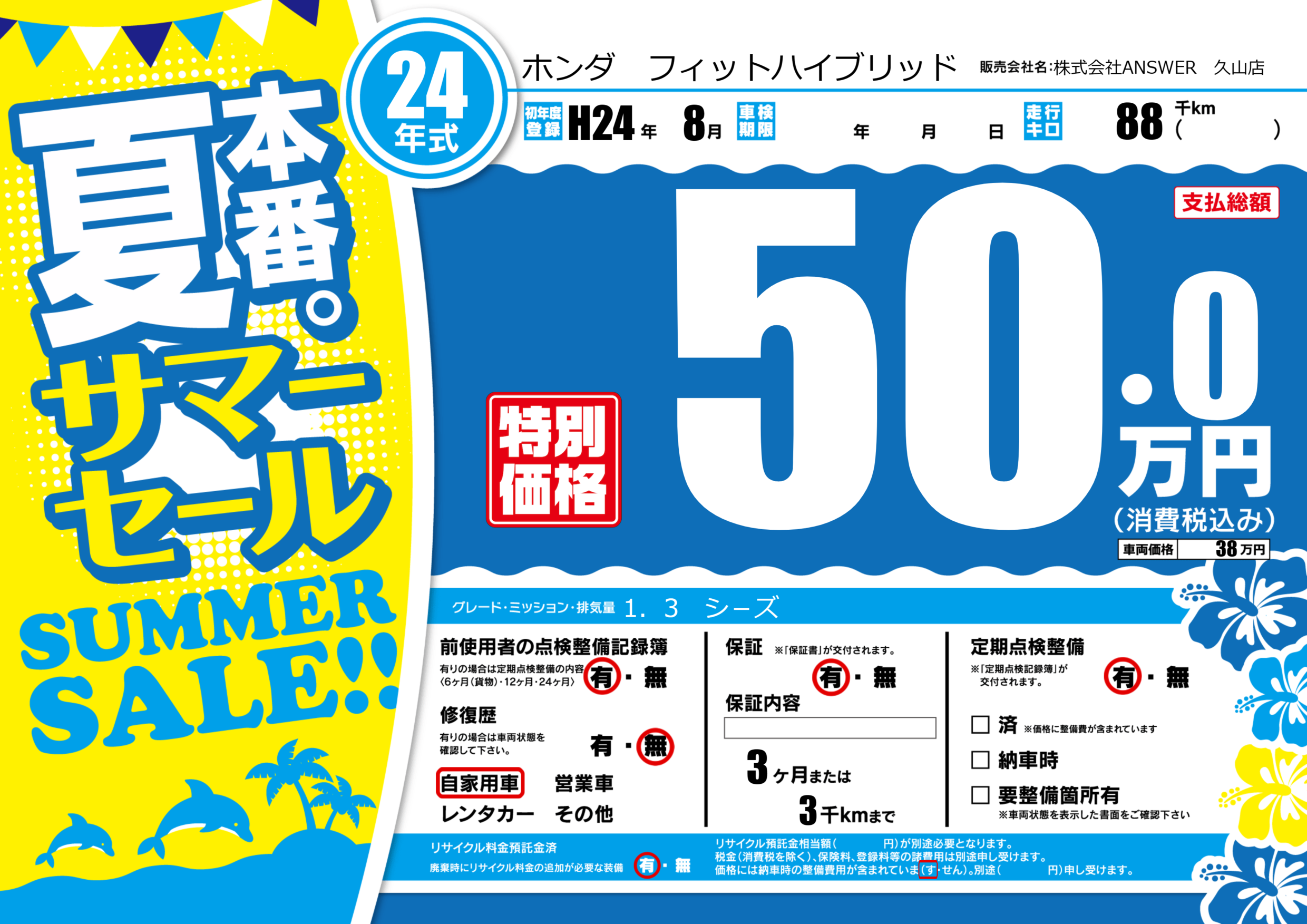 | 走行キロ | 8.8万km | 初年度登録 | H24年8月 |