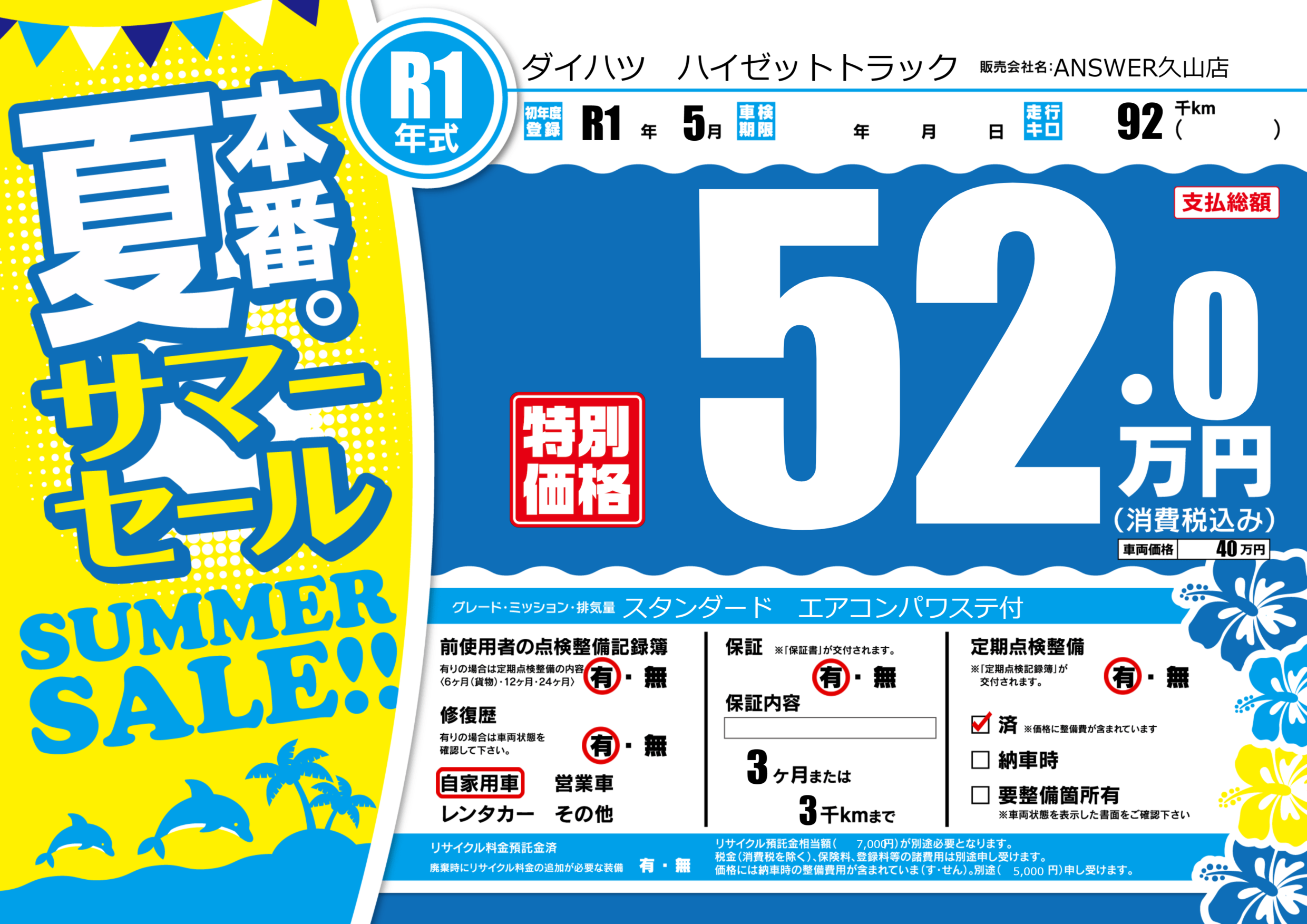 | 定期点検整備 | 定期点検整備あり 定期点検整備済み | ||