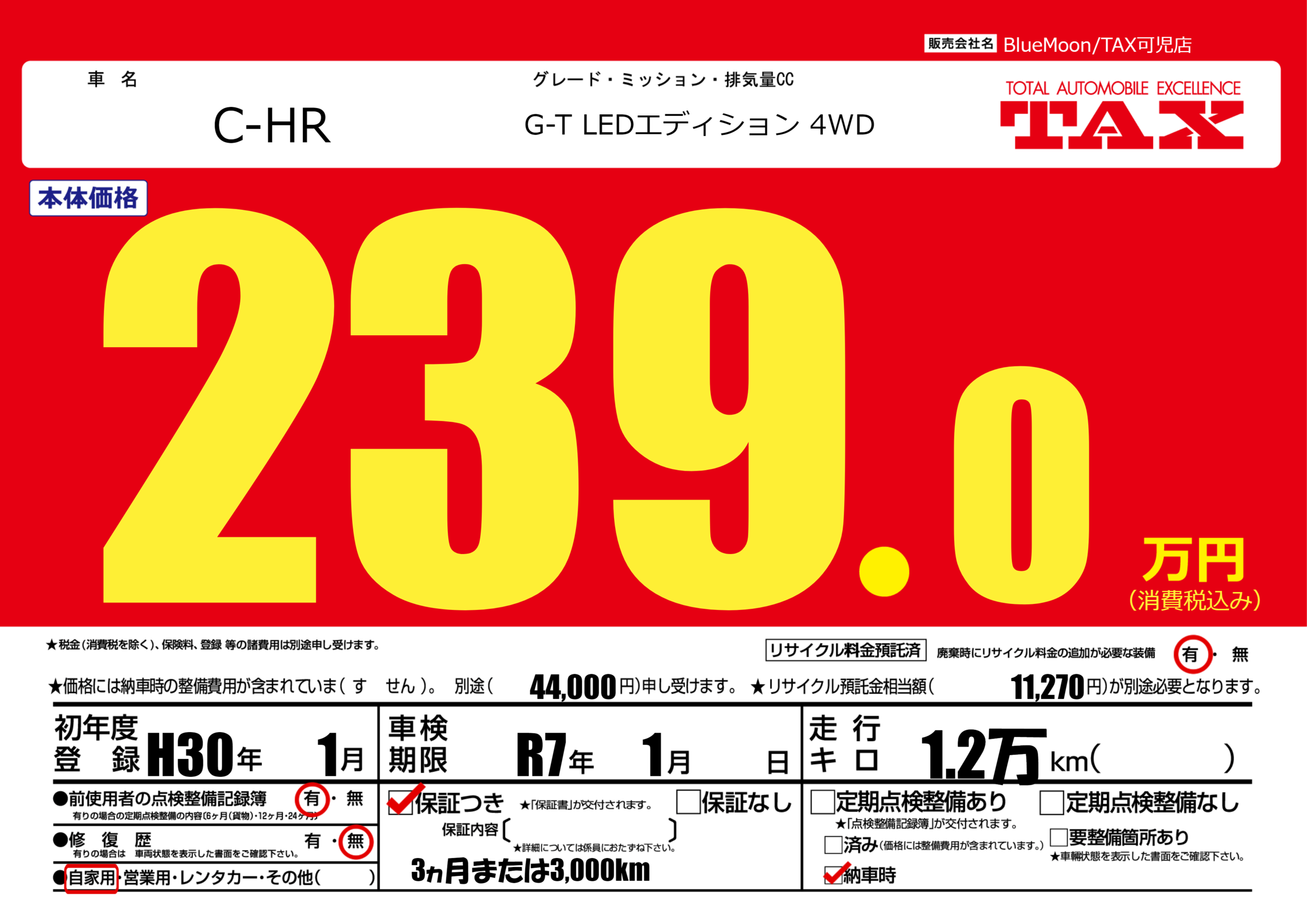 | 車名 | C-HR | グレード ミッション 排気量 |
