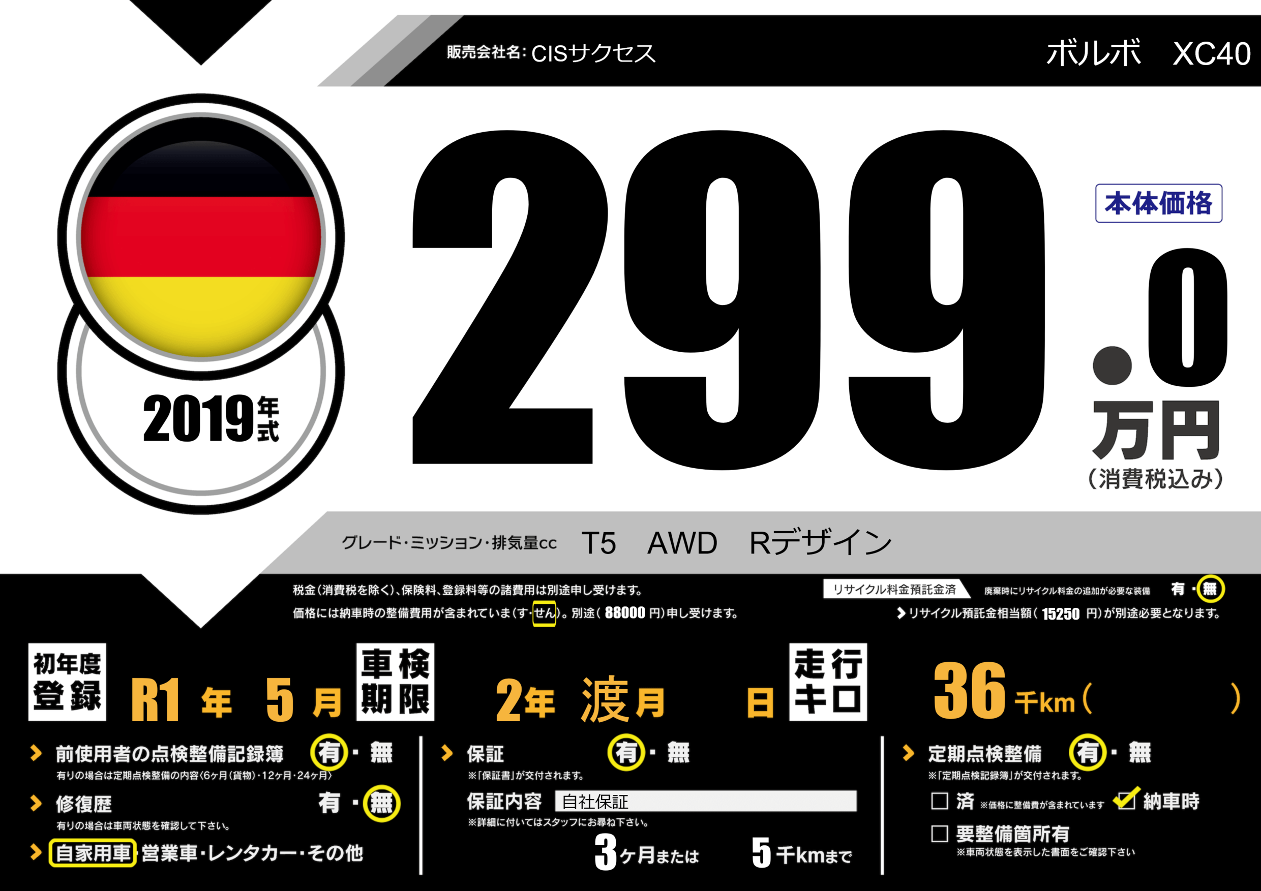 | 車名 | ボルボ XC40 | グレード ミッション 排気量 |