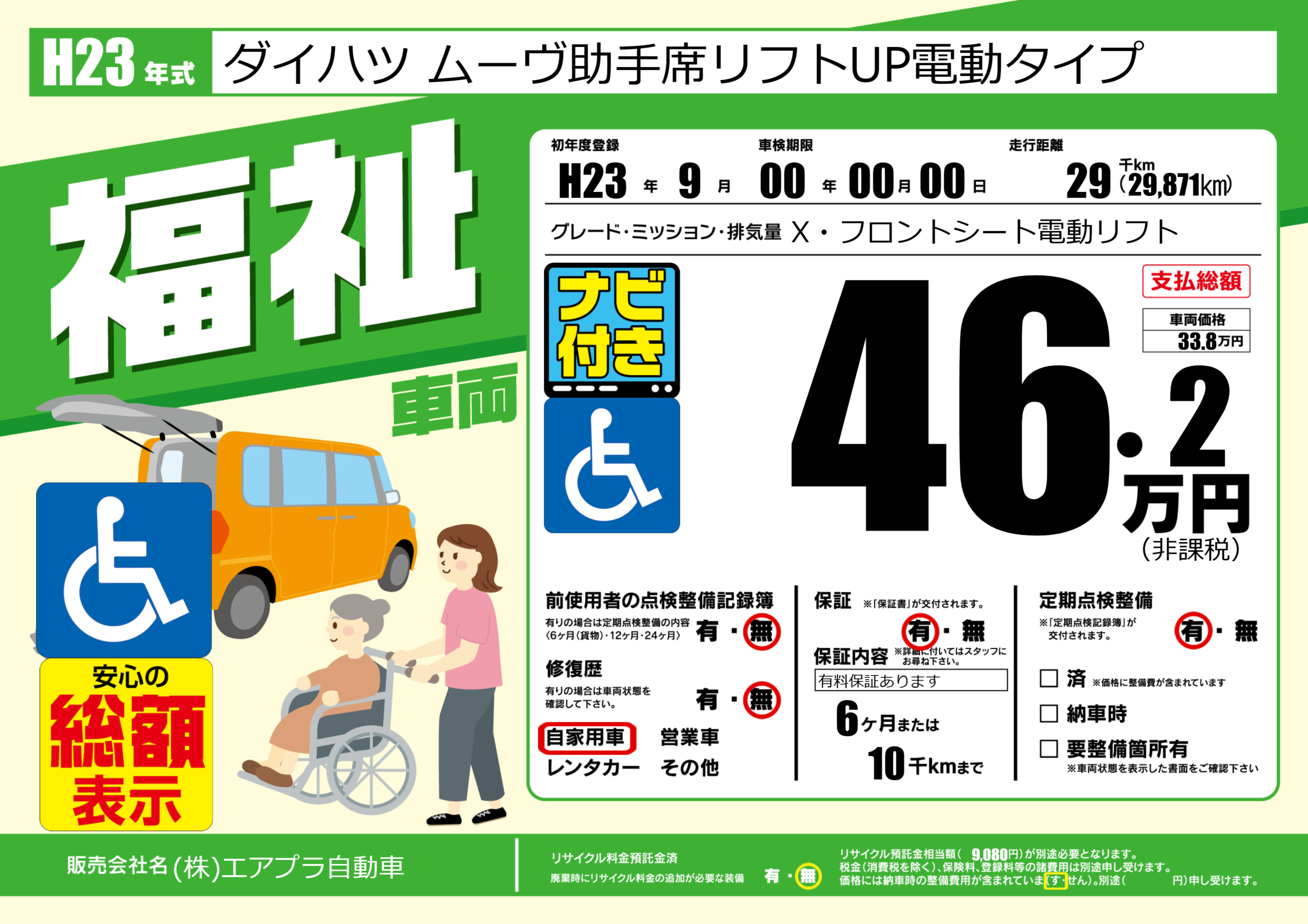 | 車名 | ダイハツ ムーヴ助手席リフトUP電動タイプ | グレード ミッション 排気量 |