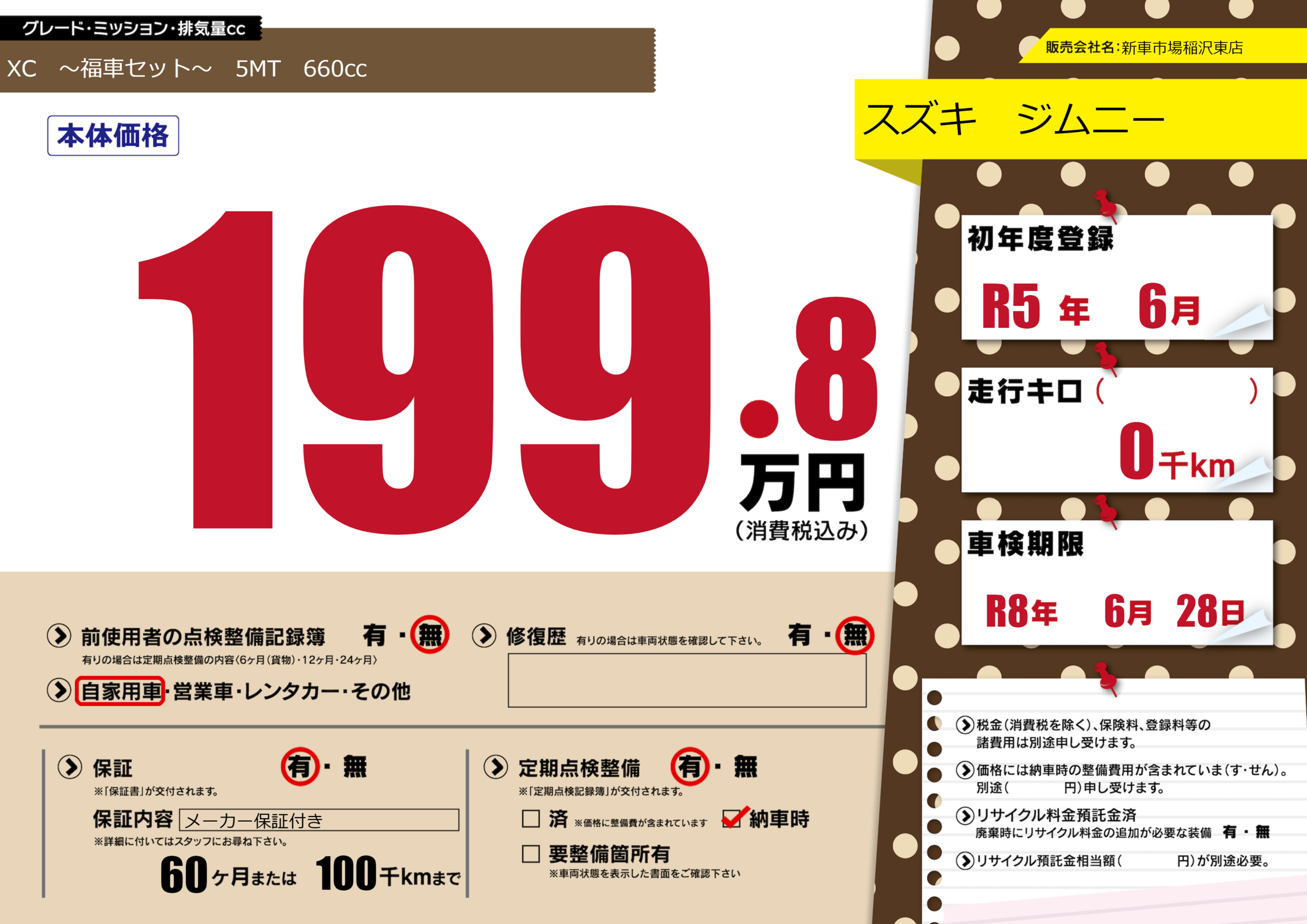 | 車名 | スズキ ジムニー | グレード ミッション 排気量 |