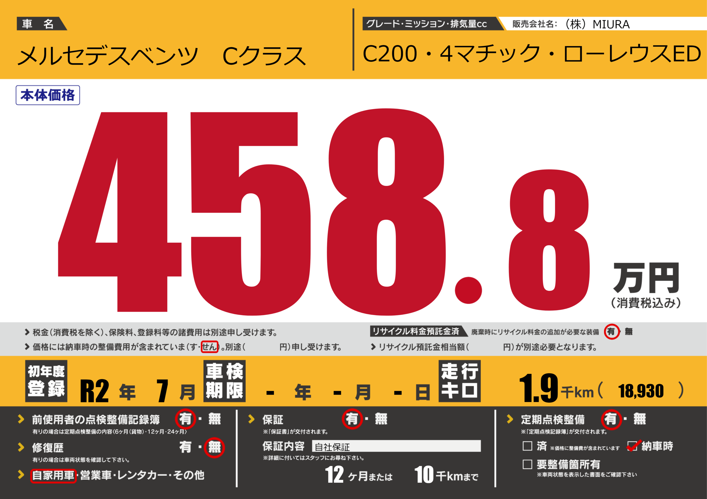 | 車名 | メルセデスベンツ Cクラス | グレード ミッション 排気量 |