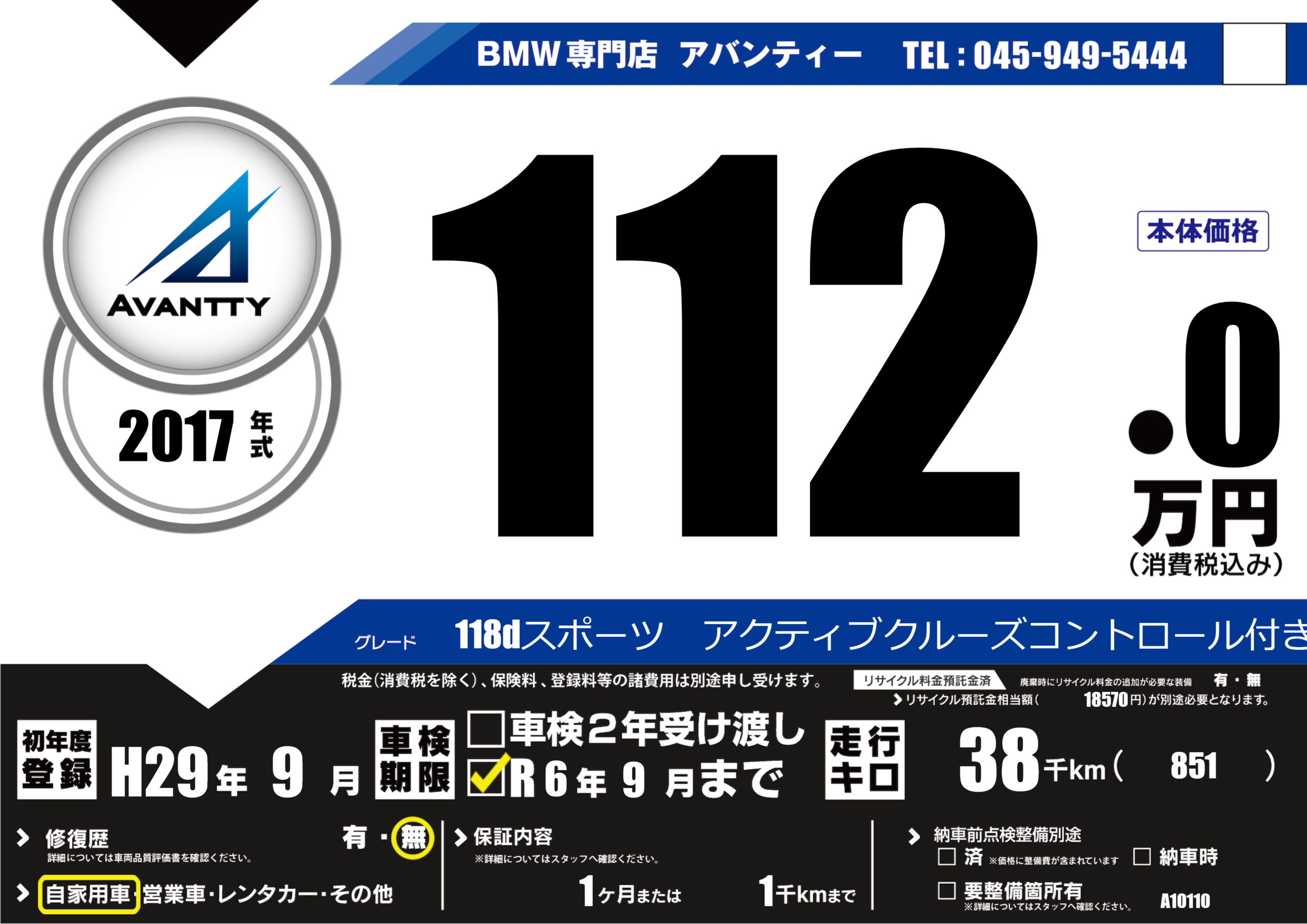 | 走行キロ | 3.8万km | 初年度登録 | H29年9月 |