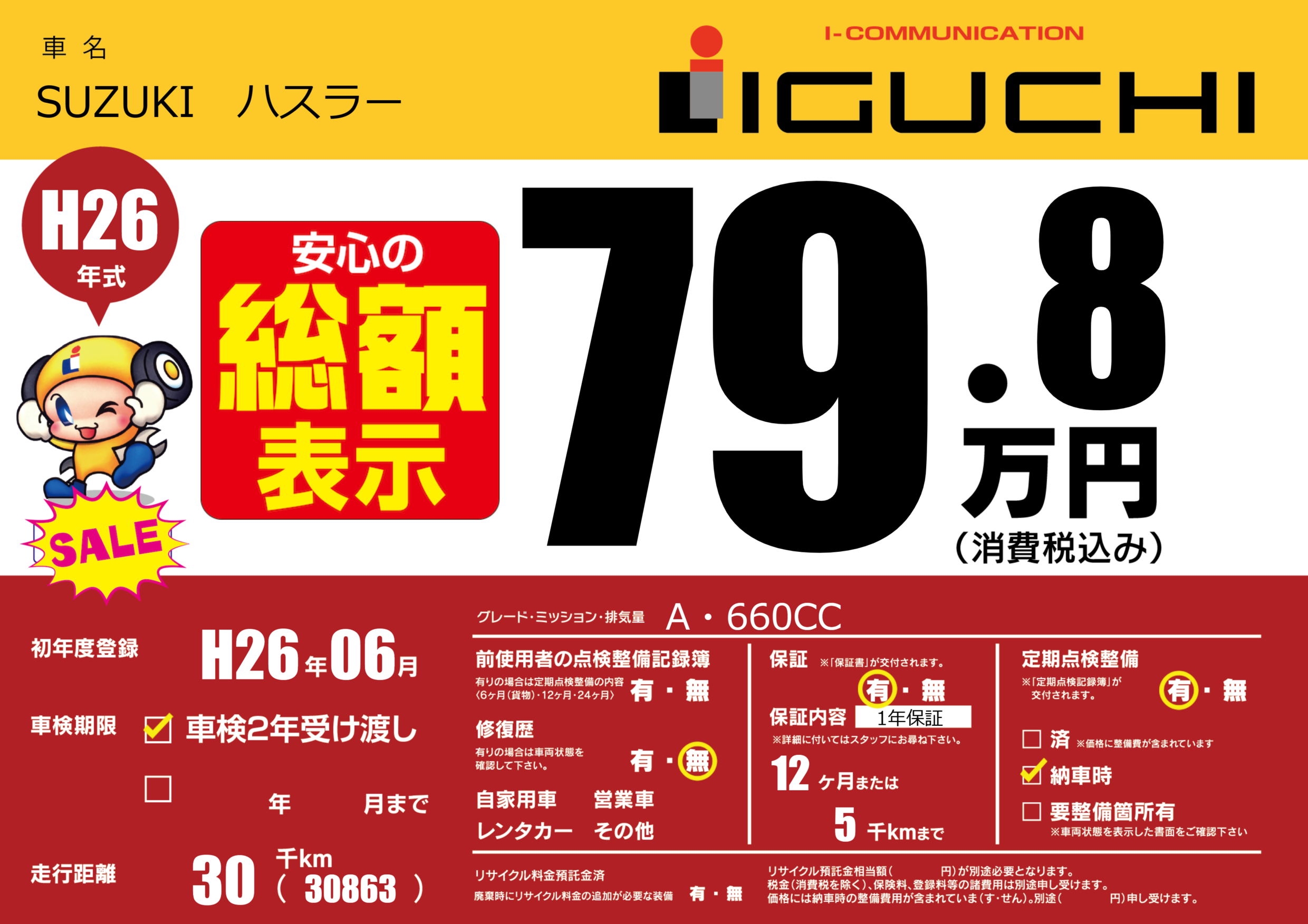 | 車名 | SUZUKI ハスラー | グレード ミッション 排気量 |