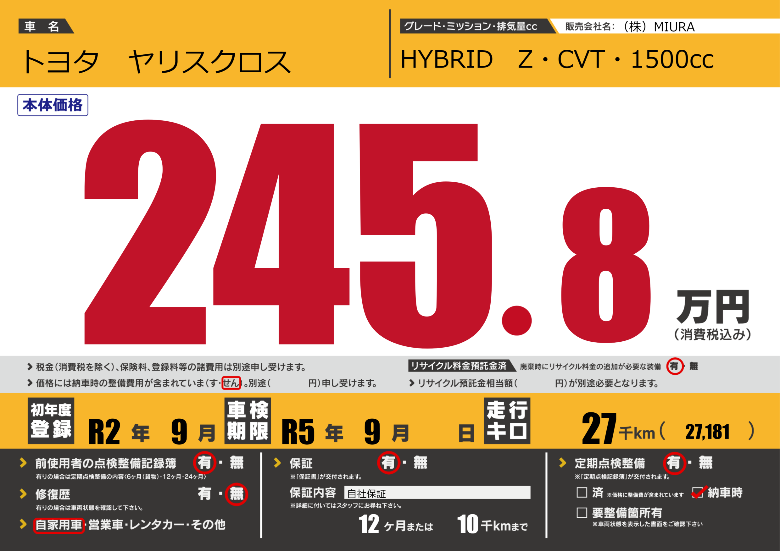 | 車名 | トヨタ ヤリスクロス | グレード ミッション 排気量 |