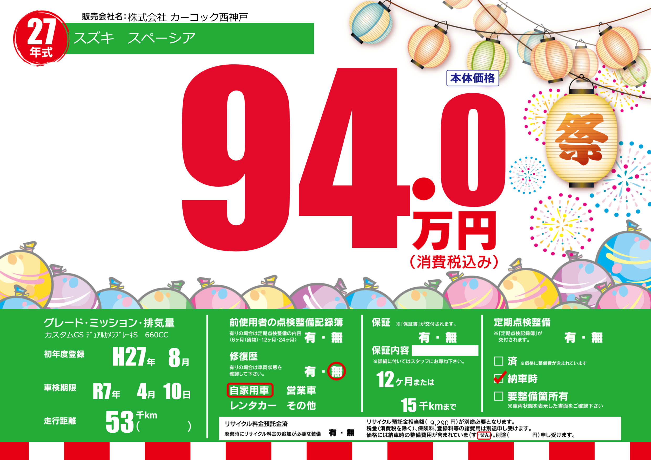 | 走行キロ | 5.3万km | 初年度登録 | H27年8月 |